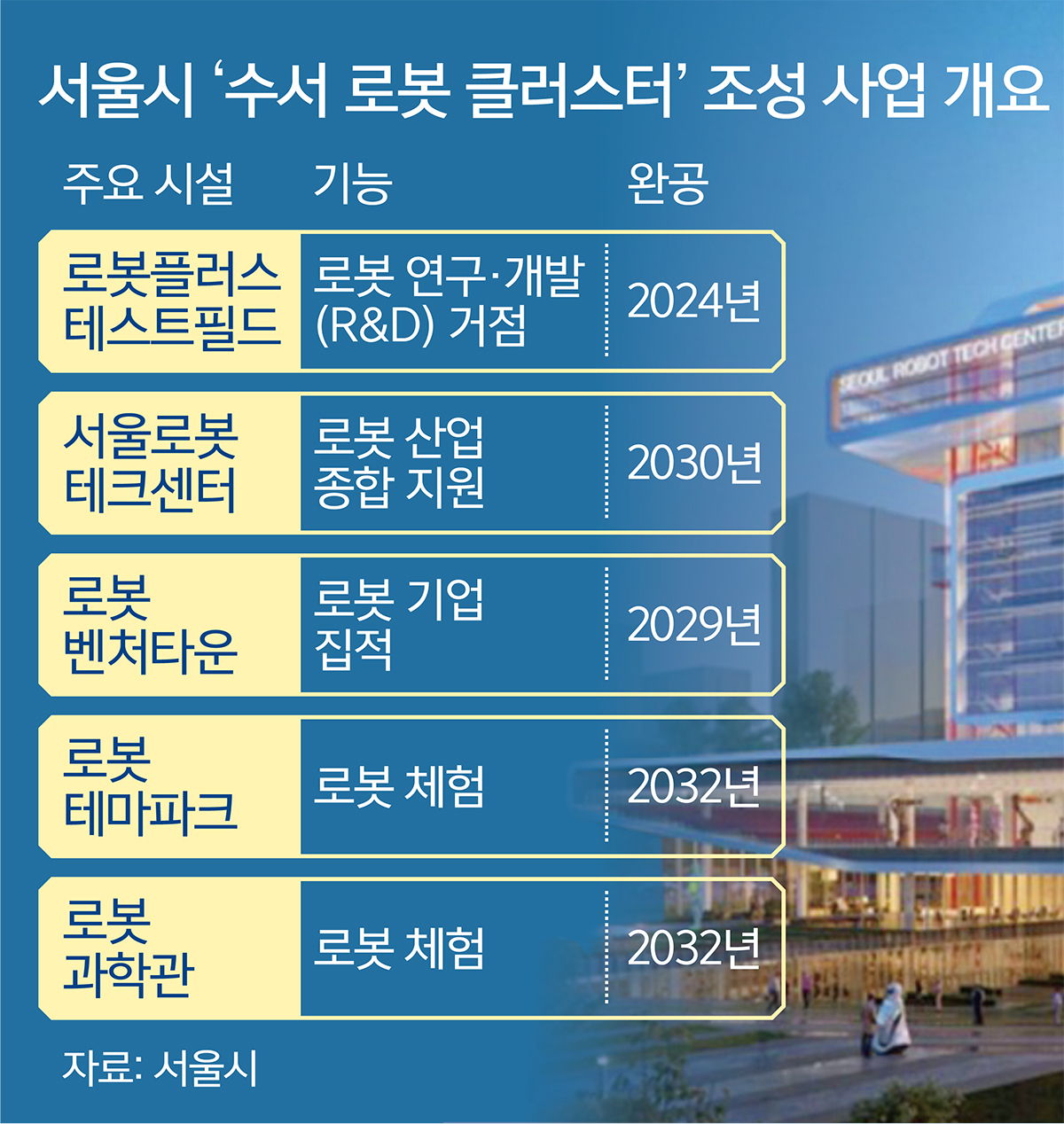 우선 핵심 시설인 서울로봇테크센터가 2030년 완공될 예정이다. 센터는 로봇 기술 개발부터 실증, 창업까지 지원하는 로봇 산업 종합 지원 거점이다. 로봇 친화형 건물로 지어져 다양한 로봇 서비스가 구현된다.