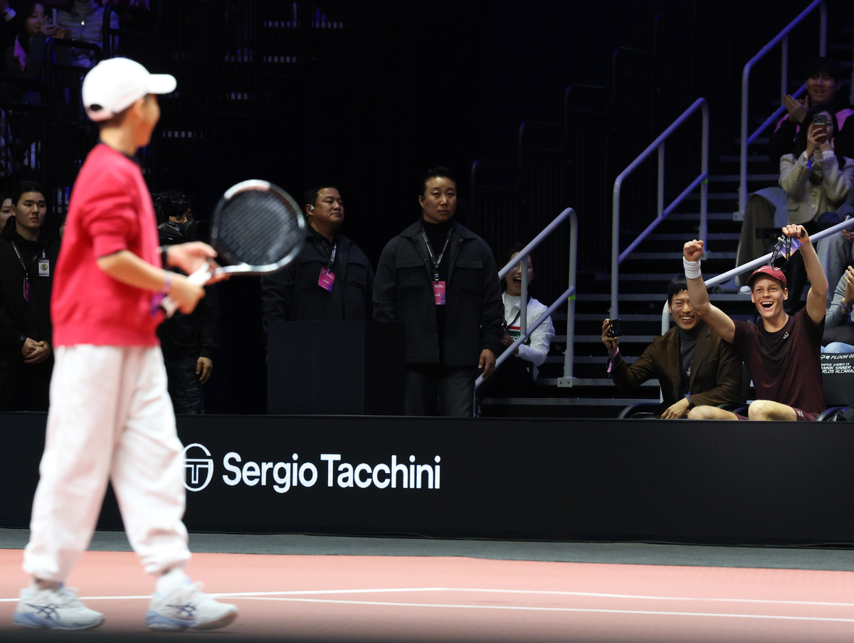 10일 인천 인스파이어 아레나에서 열린 현대카드 슈퍼매치14. 이탈리아 얀니크 신네르가 스페인 카를로스 알카라스를 상대로 경기를 펼치던 중 한 어린이 팬에게 경기를 맡기고 관중석에 앉아 있다. 연합 두 선수는 팬 서비스도 최고였다. 신네르에게 한 팬이 ‘I LOVE YOU’라며 팬심을 드러내자 신네르는 서브하려던 공을 팬에게 선물한 뒤 손 하트를 그려보였다. 이에 뒤질세라 알카라스의 팬도 ‘I LOVE YOU’를 외치자 양손으로 하트를 만들어 보낸 뒤 손가락 하트도 날렸다. 회심의 스트로크를 성공하면 어퍼컷 세리머니도 하고, 슬라이스샷 대결에서 승리한 뒤엔 두 팔 벌려 환호성을 온 몸으로 맞기도 하는 등 두 선수는 팬들과 호흡하며 경기를 즐겼다. 특히 실전에서는 좀처럼 감정을 드러내지 않는 신네르는 이날 시종일관 얼굴에 미소를 띠고 경기에 임했다. 2세트에는 관중석에 테니스를 하는 유망주 어린이에게 자신의 라켓을 내주며 ‘직접 경기를 하라’며 격려하기도 했다. 어린이는 알카라스의 배려 속에 멋진 샷으로 포인트에 성공했다.