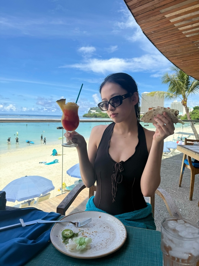 화이트 컬러의 자수 민소매 톱을 입은 채 샴페인 잔을 든 모습에서는 성숙한 분위기가 물씬 풍겼다. 검은색 비키니에 시스루 커버업을 매치한 사진에서는 군살 하나 없는 완벽한 몸매와 직각 어깨라인을 자랑했다.