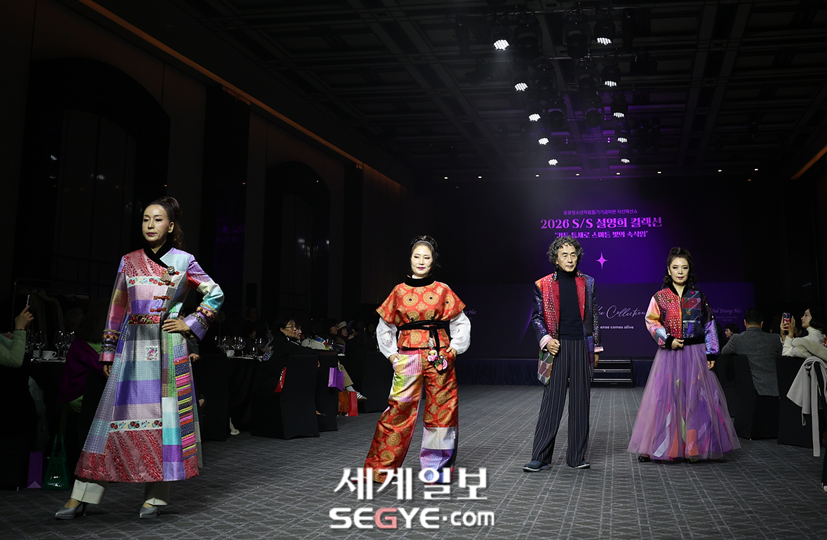 들꽃청소년 자립돕기 기금 마련을 위한 설영희 디자이너의 2026 S/S 자선 패션쇼가 19일 서울 용산구 그랜드하얏트호텔에서 열렸다. 모델들이 런웨이에서 의상을 선보이고 있다. 이번 패션쇼는 '커튼 틈새로 스며든 빛의 속삭임'을 주제로, 디자이너 설영희의 시선으로 포착한 빛과 그 이면의 감성을 섬세하게 표현했다. 좁은 커튼 사이로 스며드는 한 줄기 햇살, 그 빛 속에서 반짝이며 살아 움직이는 먼지의 모습에서 영감을 받아 절제되면서도 깊이 있는 아름다움을 컬렉션 전반에 담아냈다.