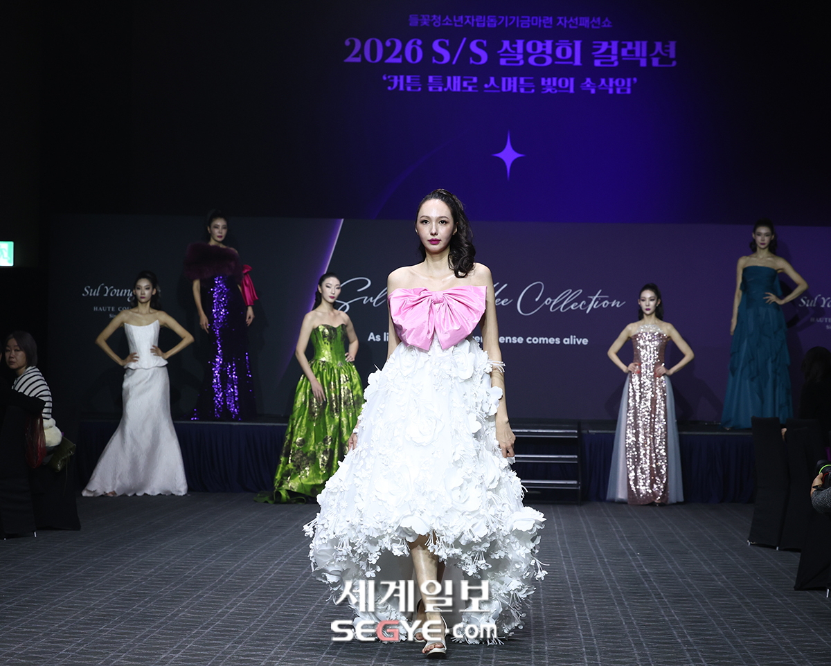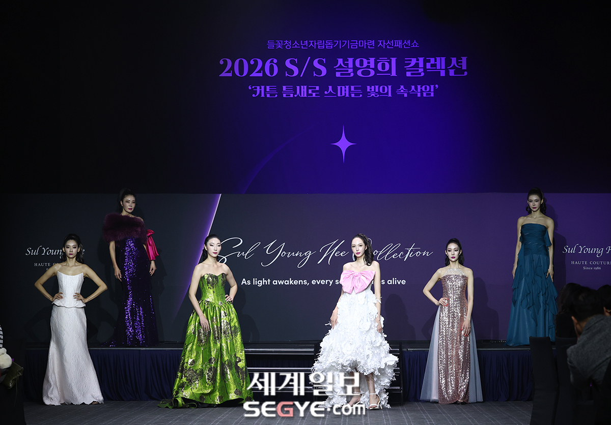 들꽃청소년 자립돕기 기금 마련을 위한 설영희 디자이너의 2026 S/S 자선 패션쇼가 19일 서울 용산구 그랜드하얏트호텔에서 열렸다. 모델들이 런웨이에서 의상을 선보이고 있다.