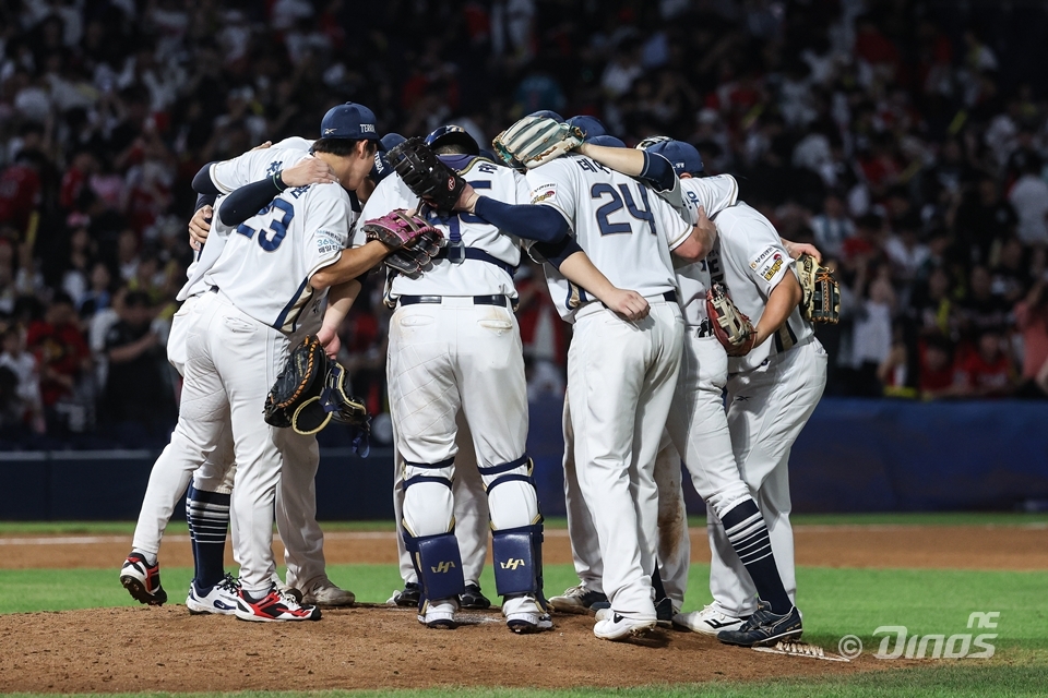 NC 선수단이 승리를 거두고 마운드에서 세리머니를 펼치고 있다. 사진=NC다이노스 제공