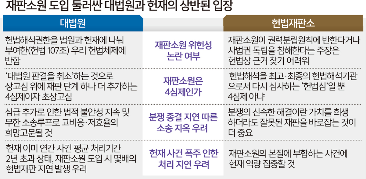 반면 헌재는 “분쟁의 신속한 해결이란 가치를 희생하더라도 잘못된 재판을 바로잡는 것이 더 중요하다”면서 “헌법소원이 인용돼 재판이 취소되는 경우는 전체 분쟁 사건의 극히 일부에 지나지 않는다”고 반박했다. 법조계에선 ‘극히 일부만’ 인용되는 재판소원 제도 도입으로 인해 결국 기각이나 각하될 나머지 다수 사건들이 장기간 법적 불안정 상태에 놓이게 되는 것 아니냐는 반론도 나온다.