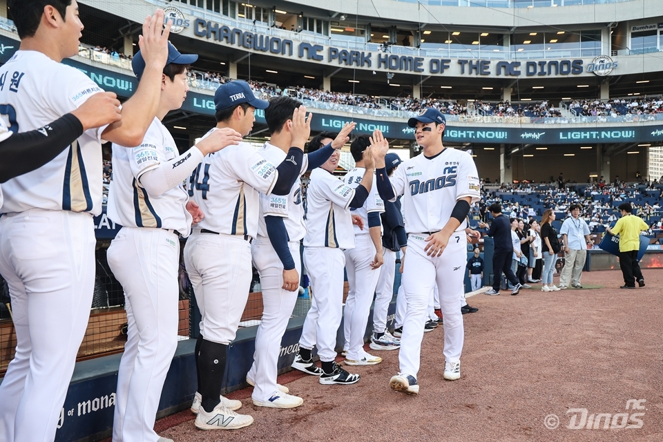 NC 김주원이 경기 전 동료들과 선전을 다짐하며 하이파이브를 나누고 있다. 사진=NC다이노스 제공 무엇보다 결과가 아닌 과정에 초점을 맞춘 게 큰 힘이 됐다. 그는 “당장 뚜렷한 성과가 나오지 않더라도 좋은 방향으로 나아가는 과정과 훈련에 집중했다. 압박감을 내려놓고 눈앞의 과제들에 하나씩 집중한 게 이렇게 시간이 흘러 결과로 나오는 게 아닐까”라고 미소 지었다.