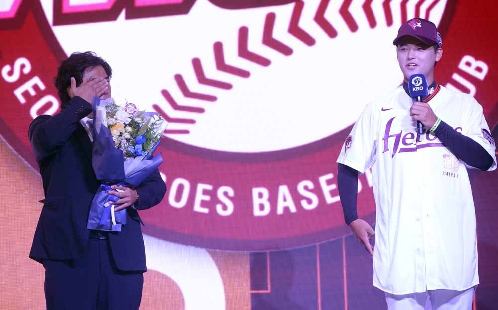 사진=김두홍 기자 오랫동안 기다렸던 순간일 터. 아버지와 나란히 무대에 올랐다. 키움 유니폼과 모자를 건네받은 박준현은 담담하게 소감을 밝혔다. 주변 분들에 감사함을 전하며 “야구 시작하면서 전체 1순위가 목표였다. 이루게 해주신 키움 관계자분들께 정말 감사드린다”고 말했다. 오히려 아버지 박 전 코치가 눈물을 찾지 못하는 모습이었다. 박 코치는 “울지 않겠다고 다짐하고 왔는데, 막상 서니 눈물이 난다. 야구인 2세로서 힘들었을 텐데 잘 커줘서 고맙다”고 말했다.