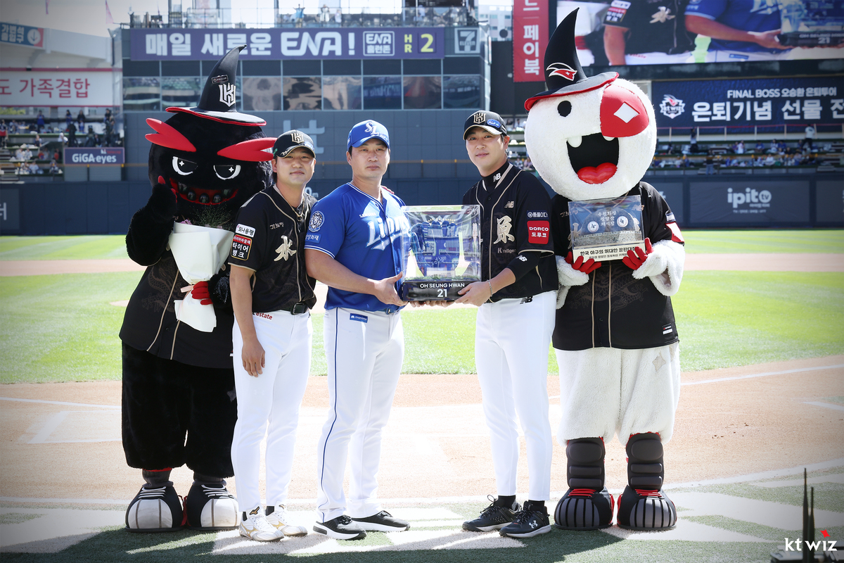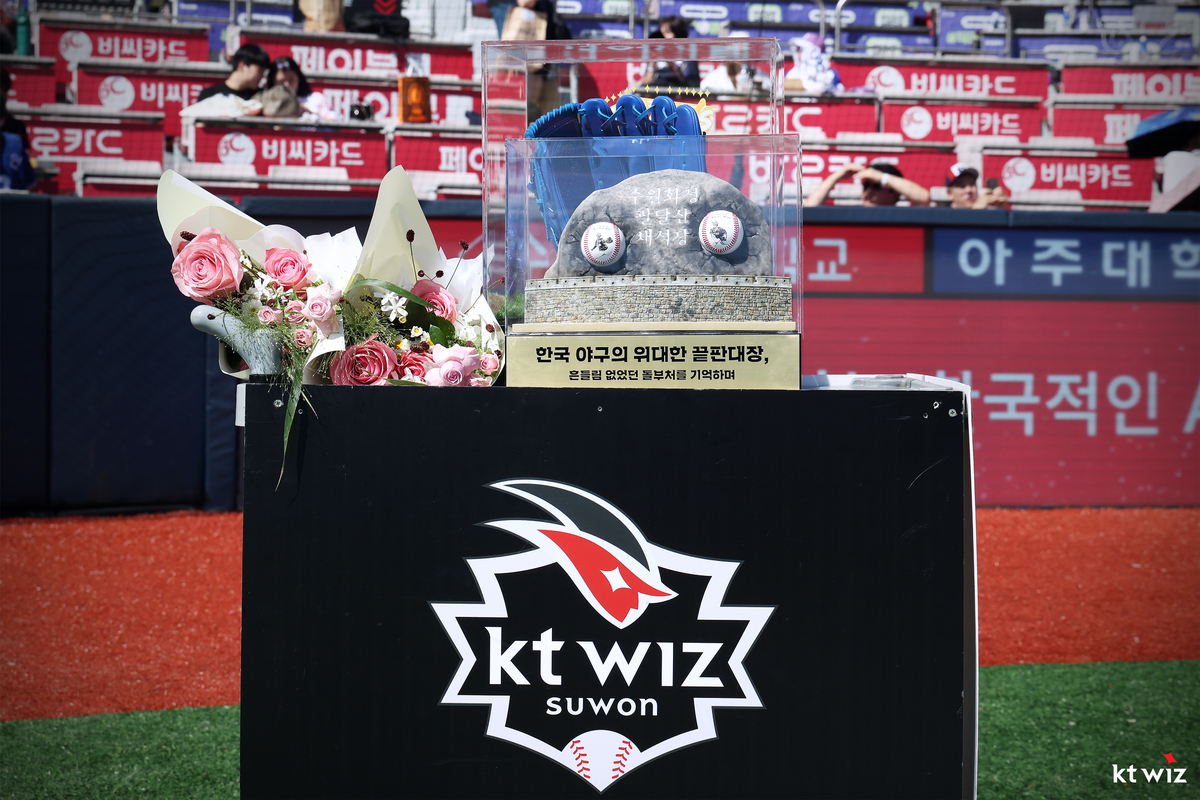 사진=삼성라이온즈 제공 오승환이 메이저리그(MLB)에서 뛰던 시절, KT 스프링캠프지(미국 투손)에서 구슬땀을 흘린 기억도 있다. 마침 가까이에서 개인 훈련을 하고 있던 오승환이 먼저 제안했다. KT 역시 흔쾌히 받아들였다. 후배 입장에선 대선배와 함께할 수 있는 절호의 기회였다. 특히 박영현은 오승환의 팬으로도 잘 알려져 있다. 오승환은 “정말 잘하고 있다. 시즌을 치르다보면 좋을 때도, 그렇지 않을 때도 있기 마련인데 박영현은 어린 나이에도 잘 이겨내고 있더라”고 격려했다. 이날 KT는 특별한 선물을 준비했다. 돌직구가 박힌 수원화성 채석장 피규어다. 정조시대, 수원 팔달산에서 돌을 채석해 수원화성 성벽을 쌓았다. 당시 채석을 위해 박은 쐐기 자국이 현재까지 남아있다는 점을 착안했다. KT는 “오랫동안 보존된 쐐기 자국에 착안해 오승환의 가장 강력한 무기인 돌직구가 팬들 기억에 오래 남길 기원한다”고 설명했다. 오승환은 사인 글러브로 화답했다. ‘KT와 함께했던 소중한 추억을 기억하겠다. 끝판대장 드림’이라고 적었다.