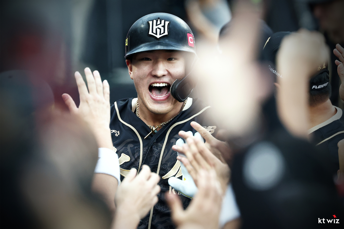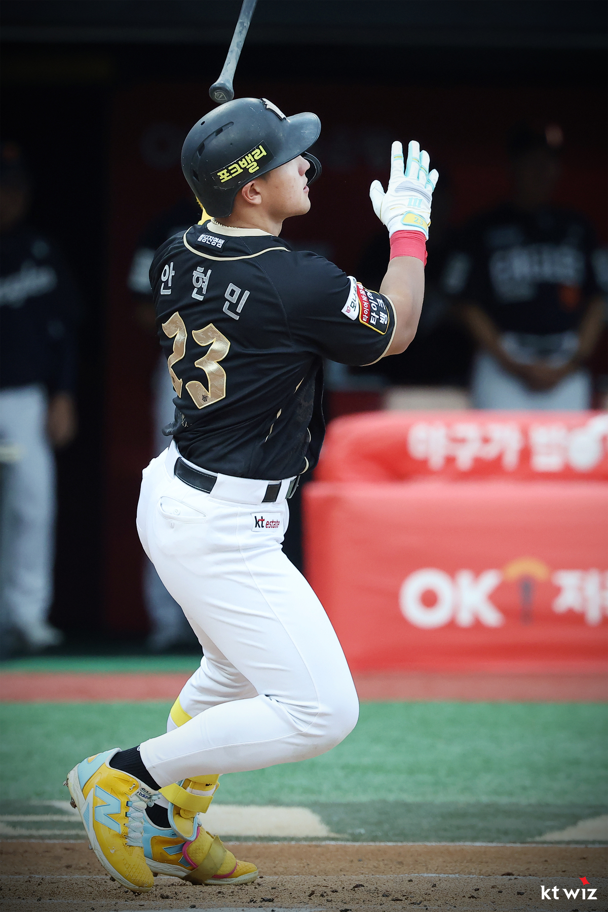 사진=KT위즈 제공 처음으로 경험하는 풀타임 시즌. 슬럼프도 있었다. 7월(21경기 타율 0.441) 불을 뿜었던 방망이가 8월 들어 갑자기 차가워진 것. 23경기를 치르는 동안 단 하나의 홈런도 치지 못했다. 나름대로 이것저것 시도를 해봤지만 마음처럼 풀리지 않았다. 안현민은 “이렇게 못 칠 수 있나 싶었다”면서 “돌이켜보면 결과가 안 나오니 조급해졌던 것 같다. 내 스윙을 가져가기보다는, 자꾸 공을 맞추려 하면서부터 안 좋아졌던 것 같다. 계속 고치려 하고 있다”고 설명했다.