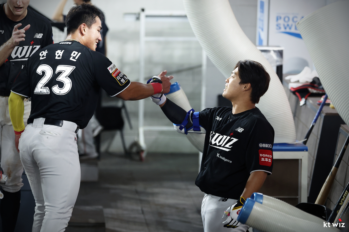 지난 23일 홈 수원 KT 위즈파크서 열린 키움전에서 함께 번뜩였다. 1회 말 3번타자 안현민이 1사 1루에서 좌익수 앞 안타를 때려내더니 후속타석에 들어선 강백호가 우중간 1타점 결승타로 화답했다. 안현민은 4타수 2안타, 강백호는 4타수 1안타 1타점 활약을 펼쳤다. 팀도 7-0 대승을 거두며 미소 지었다.