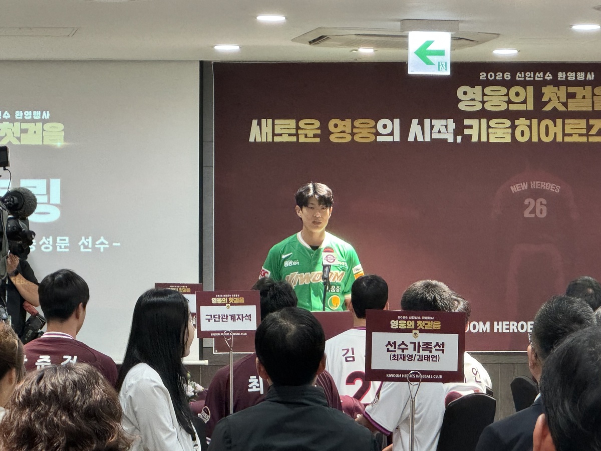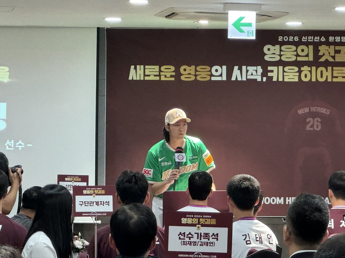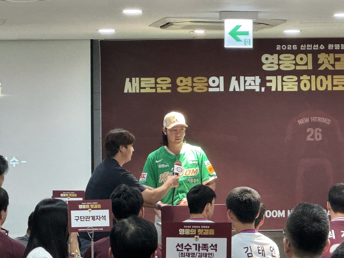 사진=최서진 기자 ‘더 큰 영웅 되거라.’ 영웅이 되기까지 수도 없이 휘둘렀던 배트와 피부가 벗겨질 정도로 던졌던 투구들을 떠올린다. 더 빨리 더 나은 영웅이 되기 위한 바람에 프로야구 키움 선배들이 나섰다. 송성문과 안우진이 2026년 신인 드래프트에서 키움의 유니폼을 입은 13명의 신인을 만나 진심 가득한 조언을 전했다.