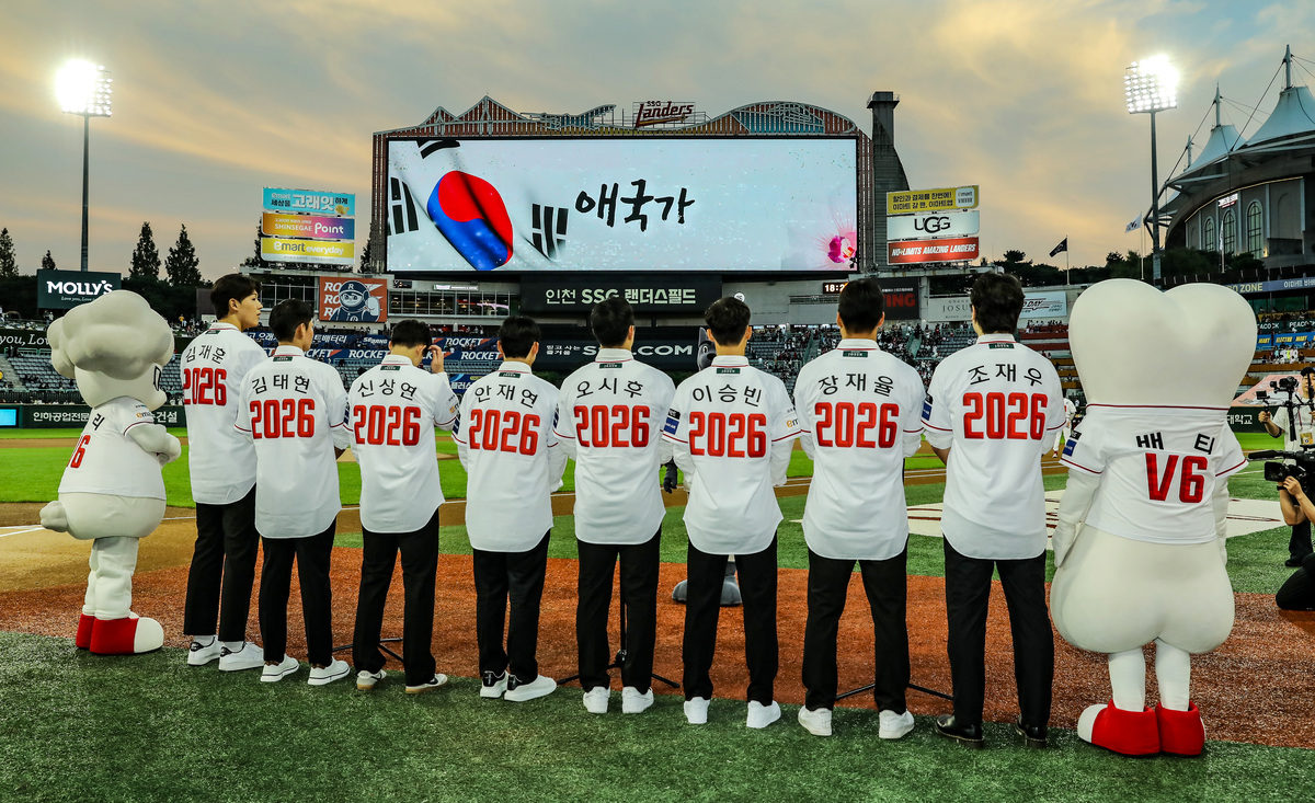 사진=SSG랜더스 제공 경기 전 팬들과 만나는 ‘루키 환영 타임’도 마련됐다. 신인들은 차례로 자기소개를 하며 긴장과 설렘이 묻어나는 목소리로 첫인사를 전했다. 김재훈, 김태현, 신상연, 안쟁연, 오시후, 이승빈, 장재율, 조재우 등이 힘찬 목소리로 애국가를 제창했다. 1라운드 지명 선수인 대구고 투수 김민준은 시구를, 2라운드 세광고 내야수 김요셉은 시타를 맡아 팬들의 큰 환호를 받았다.