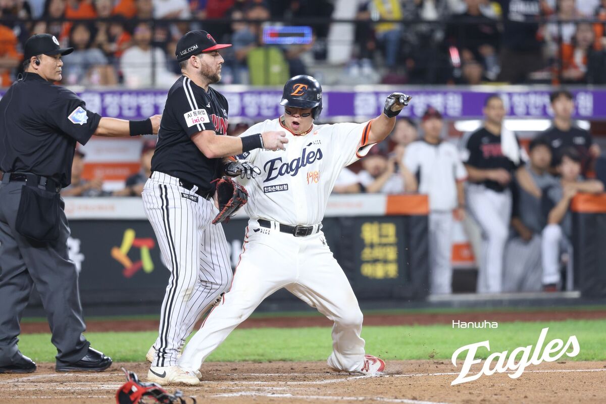 독수리도 가만히 있진 않았다. 7회 말 반격에 나섰다. 1사 2, 3루 기회를 잡고 LG의 선발투수 치리노스를 내려보낸 뒤 후속 불펜 김영우를 공략했다. 하주석이 친 투수 앞 땅볼에서 포수 포구 실책이 발생하는 등 변수가 생겼다. 3루주자 노시환의 홈 쇄도서 LG 포수 박동원이 빈 글러브로 태그한 것이 비디오판독을 거쳐 아웃에서 세이프로 정정, 동점(1-1)이 됐다.