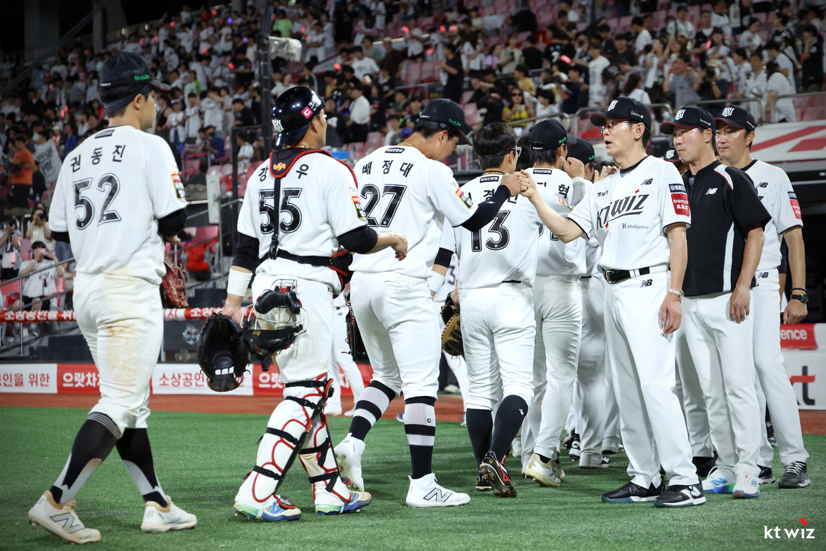 KT 선수단이 승리를 거두고 기뻐하고 있다. 사진=KT위즈 제공 일단은 1경기 차로 앞서있는 삼성이 미세하게 유리한 입장이다. 두 팀이 나란히 3경기를 남겨둔 상황. 삼성이 남은 3경기를 모두 잡으면, KT는 삼성을 따라잡을 수 없다. 그렇다고 KT가 포기할 단계는 아니다. 삼성보다 1승만 더 벌어낸다면, 2번의 무승부를 더 기록해뒀다는 점을 활용해 승률에서 미세하게 앞서 순위 역전을 노릴 수 있다. ‘끝까지 간다’를 되뇌는 이유다.