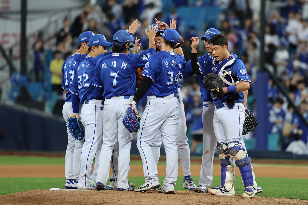 삼성 선수단이 승리를 거두고 기뻐하고 있다. 사진=삼성라이온즈 제공