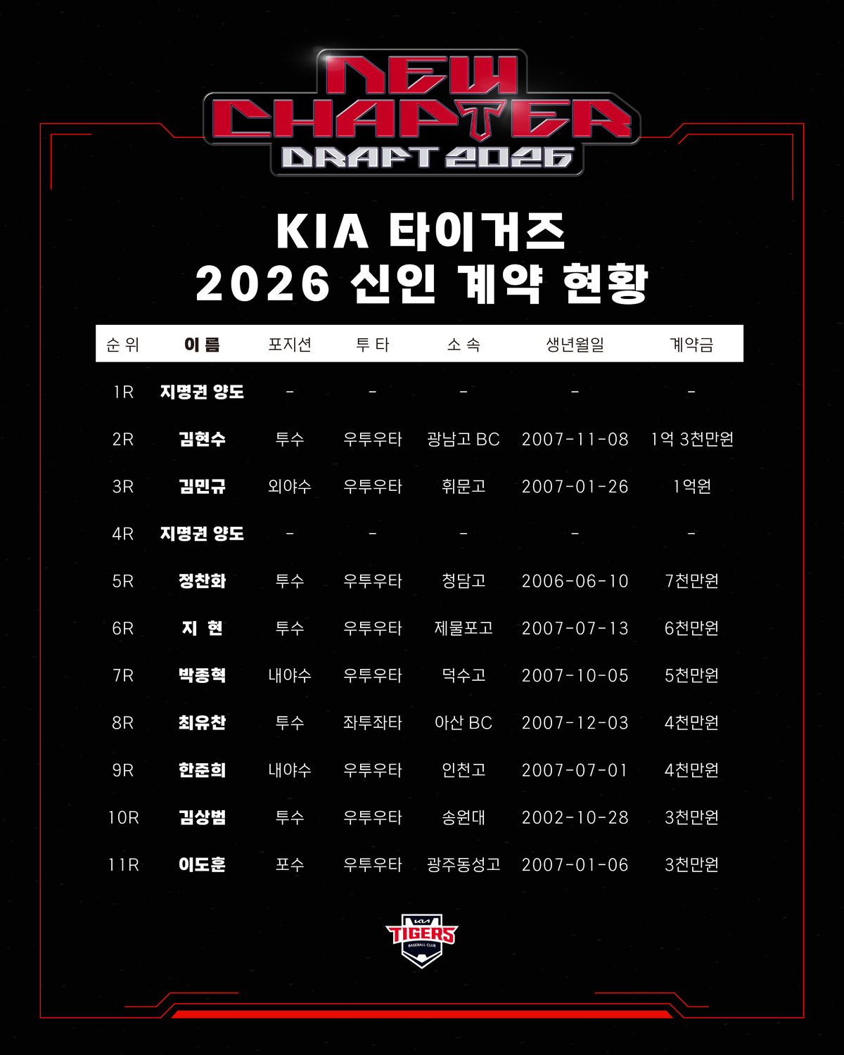 앞서 2026 KBO 신인드래프트에서 2라운드에 지명했던 투수 김현수(광남고BC)와 계약금 1억3000만원, 연봉 3000만원에 사인했다. KIA가 올 시즌에 앞서 키움과 진행한 트레이드(조상우)로 1라운드 지명권을 키움에 넘겨줌으로써 김현수가 KIA 팀 내에서는 가장 먼저 지명된 선수로 남았다.
