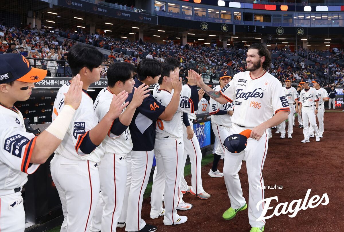 사진=한화이글스 제공 시선은 이제 폰세에게로 향한다. 10월1일 인천 SSG전에 등판한다. 당초 폰세는 28일 LG와의 홈경기에 나설 예정이었다. 폭우로 계획이 틀어졌다. 해당 경기는 우천 순연됐다. 문제는 취소 결정이 다소 늦게 내려진 것. 기상 예보가 2시(경기 시작시간)부터 잦아진다고 돼 있던 까닭이다. 지연 개시를 목표로 조치로 취해봤지만 빗방울은 다시 굵어졌다. 경기가 진행될 것을 대비해 평소 자신의 루틴대로 몸을 다 풀었던 폰세는 29일 경기에 바로 나서기 어려웠다.