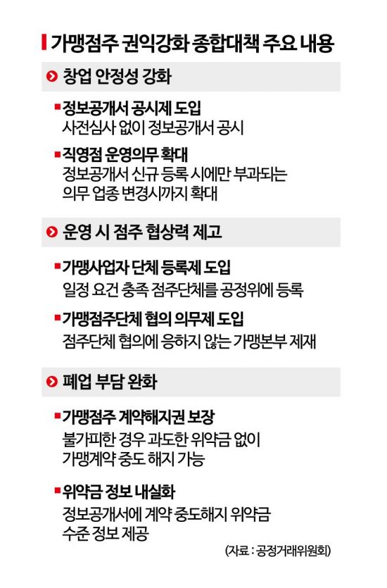 3일 업계에 따르면 공정거래위원회(공정위)가 지난달 발표한 '가맹점주 권익 강화 종합대책'의 핵심은 운영 단계에서 점주 단체가 가맹본부와 대등한 위치에서 협상할 수 있도록 제도적 기반을 마련하는 것이다. 이를 위해 '가맹점주단체 등록제'를 추진하기로 했으며, 이는 일정 요건을 충족하는 점주 단체를 공정위에 등록하게 해 공정위가 점주 단체에 공적 대표성을 부여하는 것이 골자다.