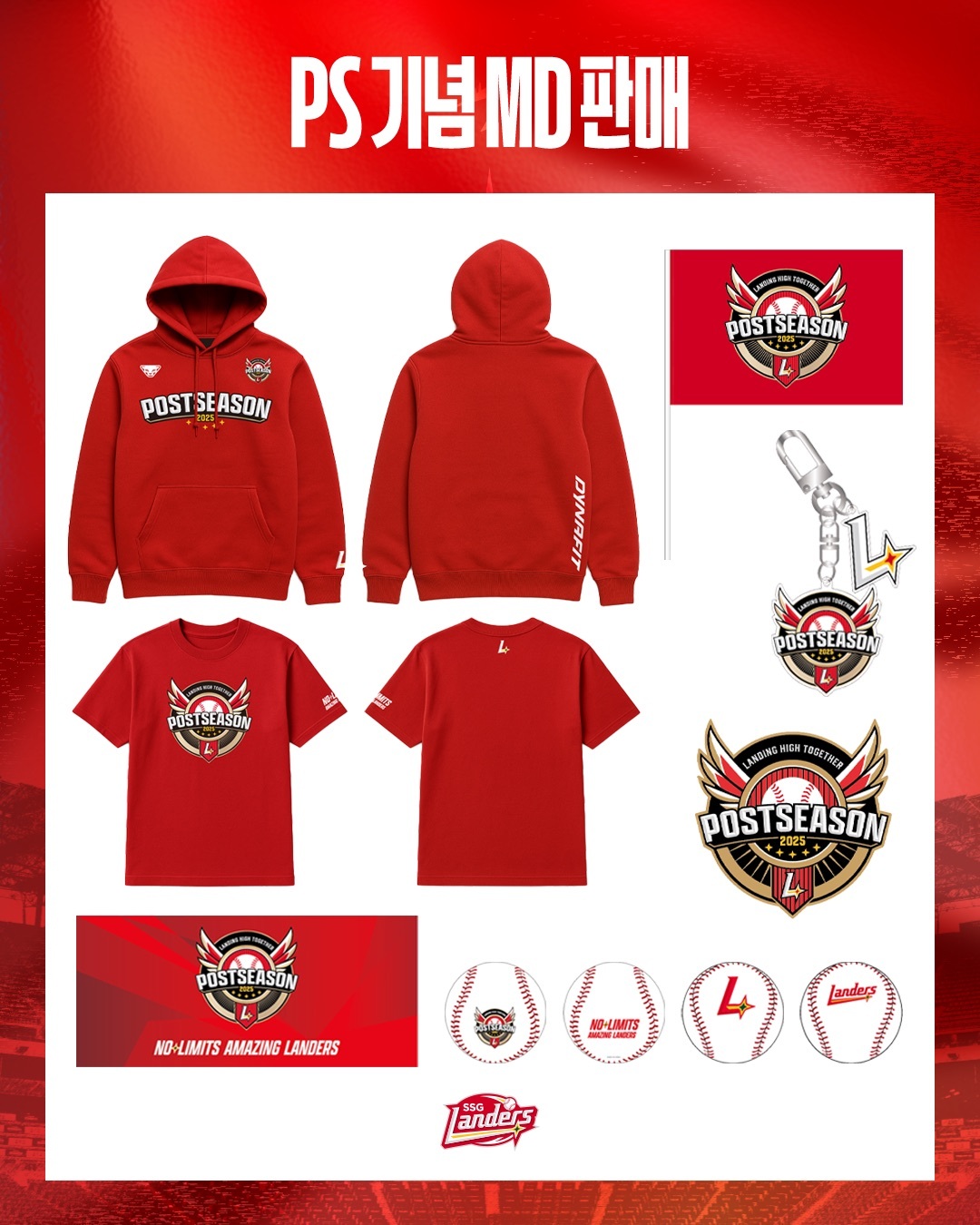 이와 함께 SSG는 ‘Red Wave’ 콘셉트를 반영한 PS 기념 MD 시리즈를 선보인다. 상품 구성은 ▲후드 ▲반팔티 ▲아크릴키링 ▲자수 와펜 ▲응원타월 ▲기념구 등이며, 오프라인 ‘랜더스샵 by Hyungji’에서 10월 9일(목) 개문과 동시에 판매된다. 단, 추석 연휴로 인해 온라인 판매는 진행되지 않는다.
