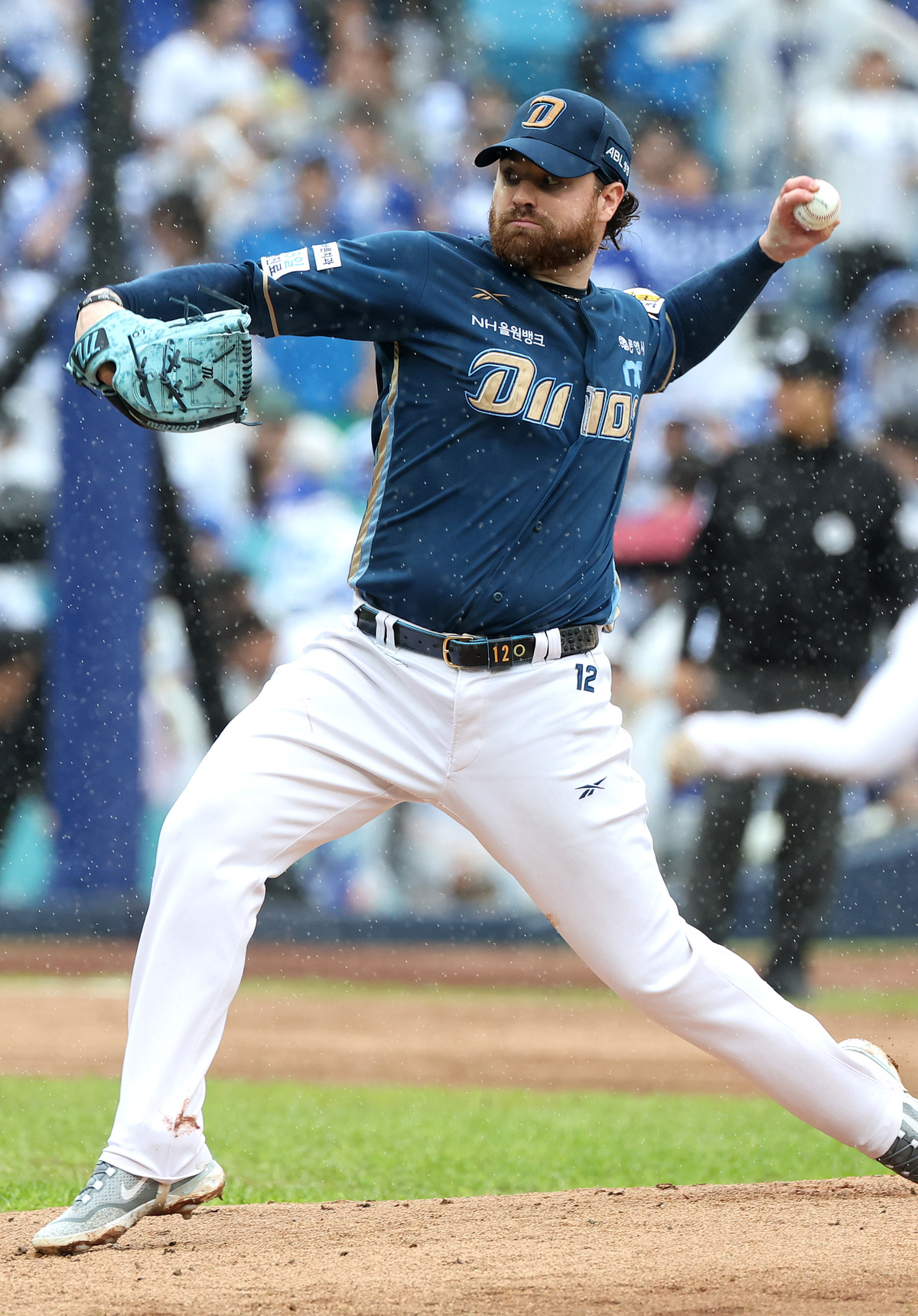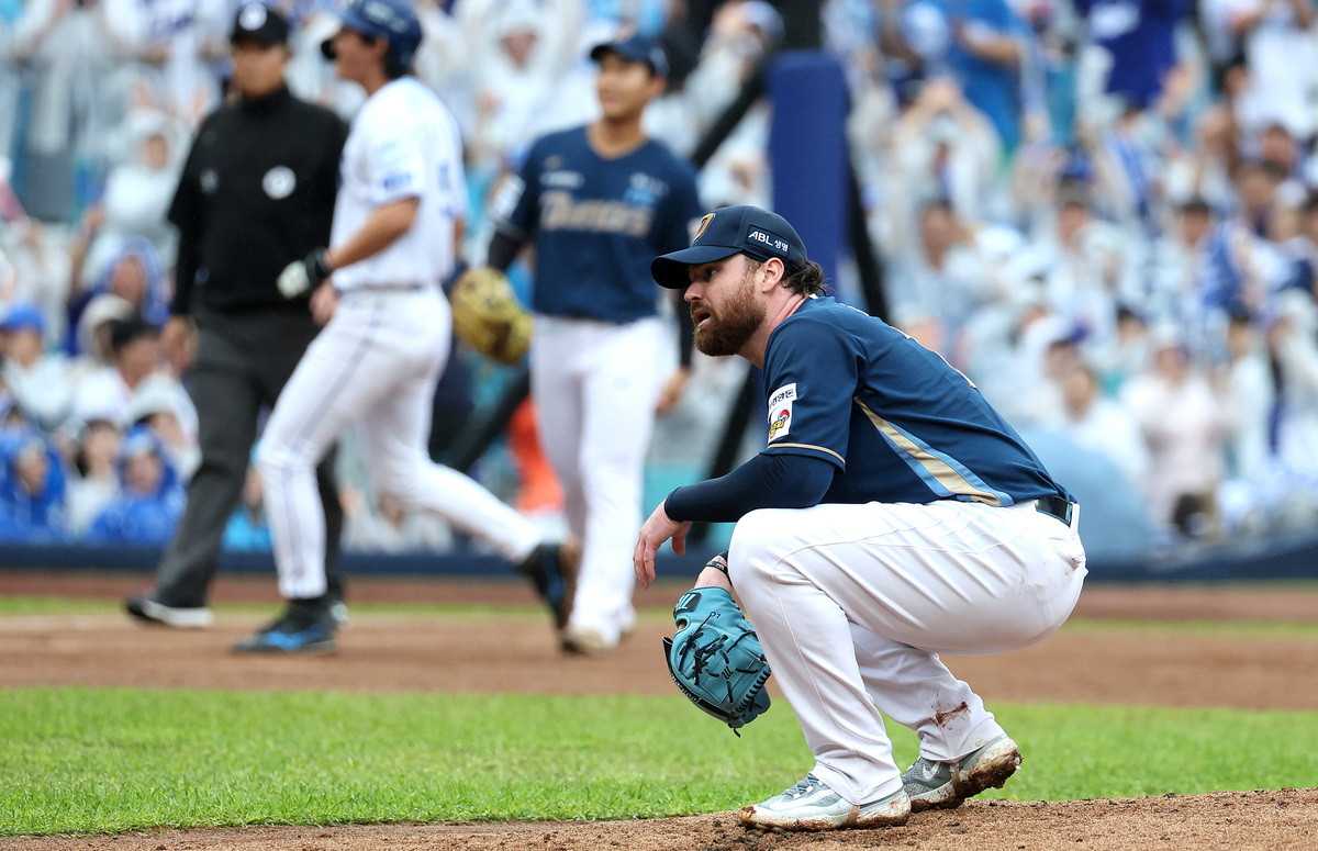 사진=뉴시스 어깨가 무거웠다. 간절함으로 가을야구 문을 뚫었지만, 모두가 지친 상태다. 주전 포수 김형준은 WC 결정 1차전서 왼손 유구골 골절상을 당해 시즌아웃됐다. 로건이 어떻게 해서든 실점을 최소화하며 길게 이닝을 끌어줘야 했다. 출발은 암울했다. 시작과 동시에 리드오프 이재현에게 안타를 허용한 것이 신호탄이었다. 1회에만 볼넷 4개를 내주며 흔들렸다. PS 한 이닝 최다 사사구 타이 불명예스러운 기록이었다. 로건에 앞서 한 이닝 4사사구는 8차례 있었다.