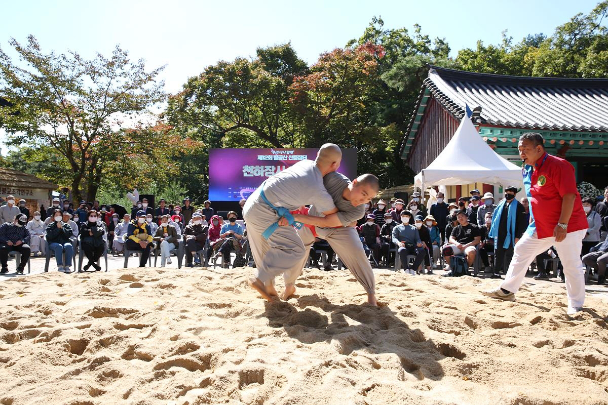 승시에서 승가 씨름대회가 열리고 있다. 대구시 제공 축제 기간 매일 오전 10시부터 오후 6시까지 △승시마당(승시재연·지역농산물 장터·사찰음식 판매) △체험마당(사찰 소리체험·전통놀이 한마당·스님과의 차담) △전시마당(가을국화와 함께하는 ‘법계도’·장엄등 한마당·사찰음식 전시) 등 상설프로그램도 운영한다. 시는 연휴 직후 나들이객 증가에 대비해 급행1번 노선버스를 2대 증차해 배차 간격을 13분에서 11분으로 단축한다. 또한 축제 기간 중 씨네80~행사장 입구 간 셔틀버스 5대, 동화사 봉황문~선원주차장 간 전기차 3대를 운행해 관람객의 안전과 편의를 지원할 예정이다.