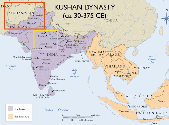 쿠샨제국 안에서도 불상 제작의 중심지는 간다라(Gandh?ra)와 마투라(Mathur?) 지역이다. 간다라는 오늘날 파키스탄 북서부와 아프가니스탄 동부 접경 지역으로, 알렉산드로스 대왕의 동방 원정 이후 그리스·로마 문화의 영향을 깊이 받은 곳이다. 이곳에서 만들어진 불상은 그리스 조각의 사실적인 인체 표현과 헬레니즘적 이상미를 반영한다. 따라서 간다라 불상에서는 두꺼운 옷 주름, 사실적인 근육 묘사, 부드러운 얼굴 윤곽, 물결치는 듯한 머리카락 등에서 서양 조형미의 세밀한 감각이 뚜렷하게 드러난다. 부처의 모습이 마치 그리스의 신이나 철학자를 연상시키는 것도 이 때문이다.