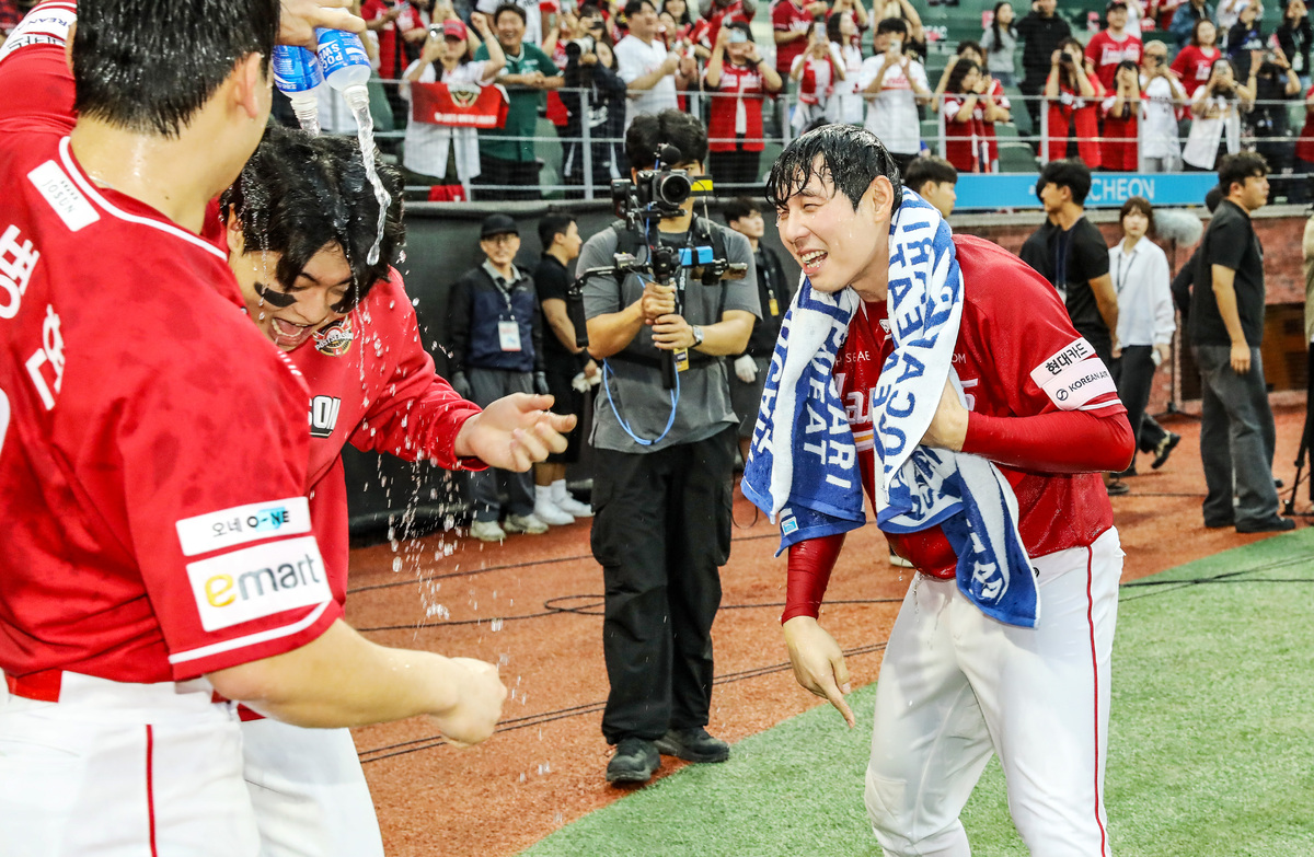 SSG 김성욱이 11일 인천SSG랜더스필드에서 열린 삼성과의 2025 KBO 포스트시즌 준플레이오프 2차전에서 팀 승리를 결정 짓는 끝내기 홈런을 터뜨리고 동료들로부터 물세례를 받고 있다. 사진=SSG랜더스 제공 흠뻑 맞은 물세례를 닦아내고 취재진과 만난 김성욱의 표정에는 밝은 미소가 서렸다. 그는 “후라도가 올라오는 걸 수비 끝나고 갑자기 전해 들었다”며 “시즌 때 후라도의 공을 잘 친 기억이 없었는데, 그냥 ‘나가면 치면 되지’라는 생각으로 타석에 섰다. 비슷한 볼 오면 자신 있게 돌리자는 생각만 했는데 좋은 결과로 이어졌다”고 홈런 상황을 복기했다. “무조건 넘어갔다고는 생각했다. 휘지만 말라고 생각하고 뛰었다”는 미소도 함께 곁들여졌다.