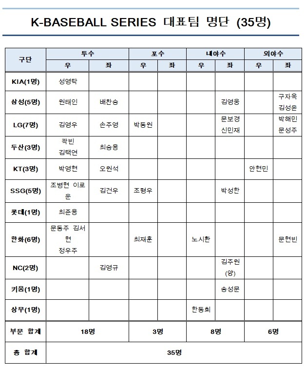 사진=KBO 제공 KBO 전력강화위원회는 오는 11월 체코와 일본을 상대로 열리는 ‘K-BASEBEALL SERIES’에 참가하는 대표팀의 명단을 확정했다. 대표팀은 투수 18명, 포수 3명, 야수 14명 등 총 35명으로 구성됐다.