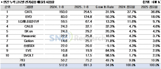 LG에너지솔루션은 전년 동기 대비 13.3%(67.4GWh) 성장하며 3위를 유지했고 SK온은20.3%(29.2GWh)의 성장률을 기록해 5위에 올랐다. 반면, 삼성SDI는 9.1%(20.0GWh) 감소하며 8위에 머물렀다.