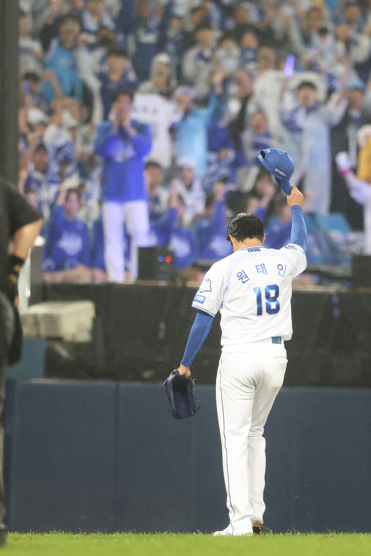 사진=삼성라이온즈 제공 닷새 쉬고 다시 마운드에 올랐다. PS의 경우 한 경기 피로도가 평소의 몇 배 이상이다. 심지어 이미 WC 결정 2차전서 106개의 공을 던졌다. 올 시즌 개인 한 경기 최다 개수였다. 그럼에도 엄청난 집중력을 발휘했다. 이날도 105개를 던졌다. 6회까지 투구 수가 100개 가까이 됐지만, 7회에도 모습을 드러냈다. 최고 151㎞에 달하는 직구를 바탕으로 슬라이더, 체인지업, 커브, 커터 등 다양한 변화구를 섞었다. 투혼을 발휘한 원태인의 피칭을 바라보며 팬들도 진한 감동을 느꼈을 터. 뜨거운 박수와 함성소리를 쏟아냈다. 원태인은 모자를 벗어 인사했다.