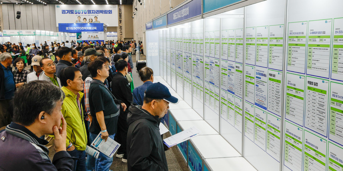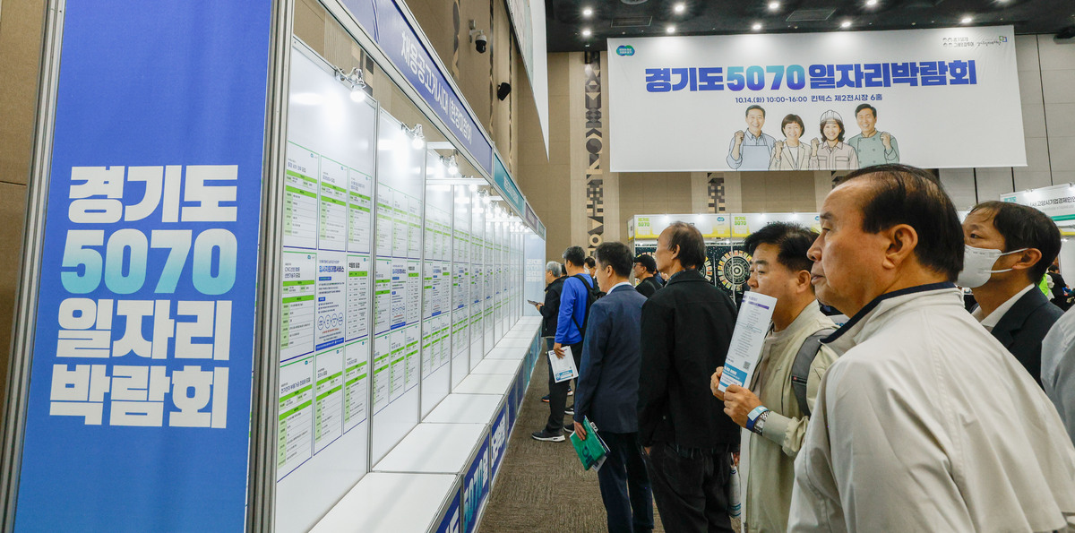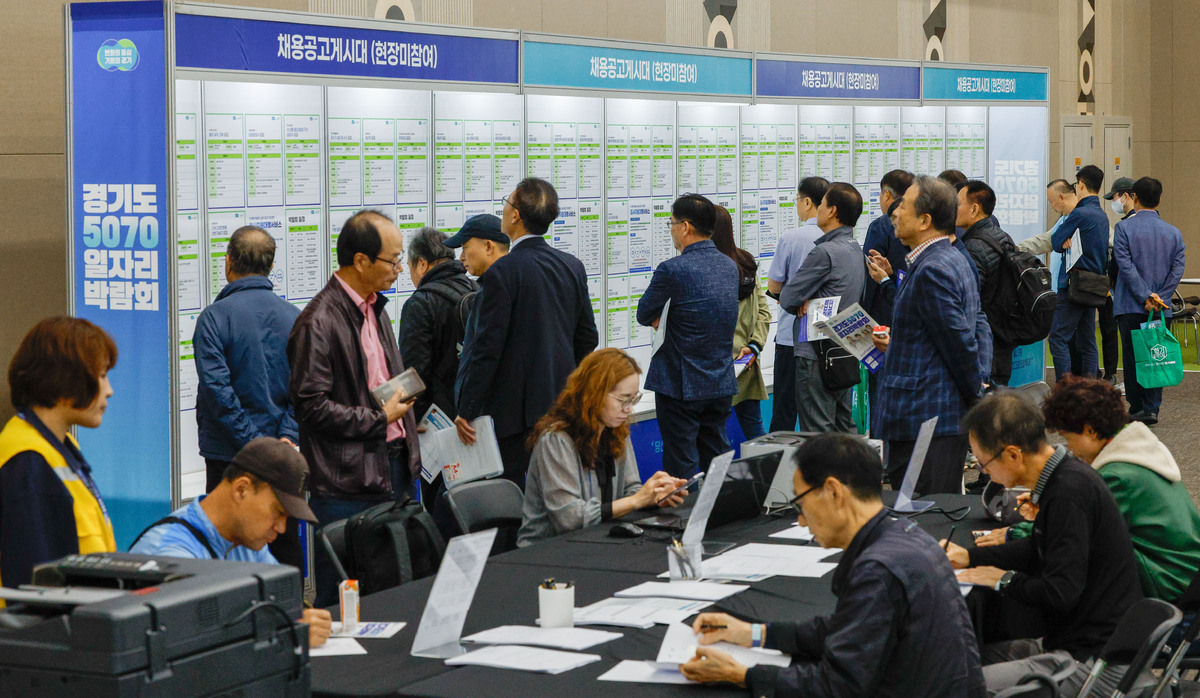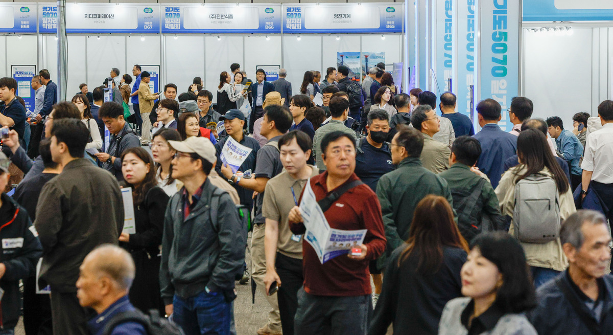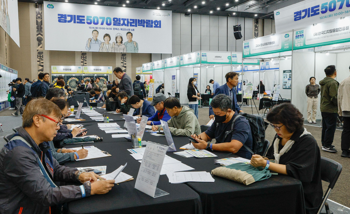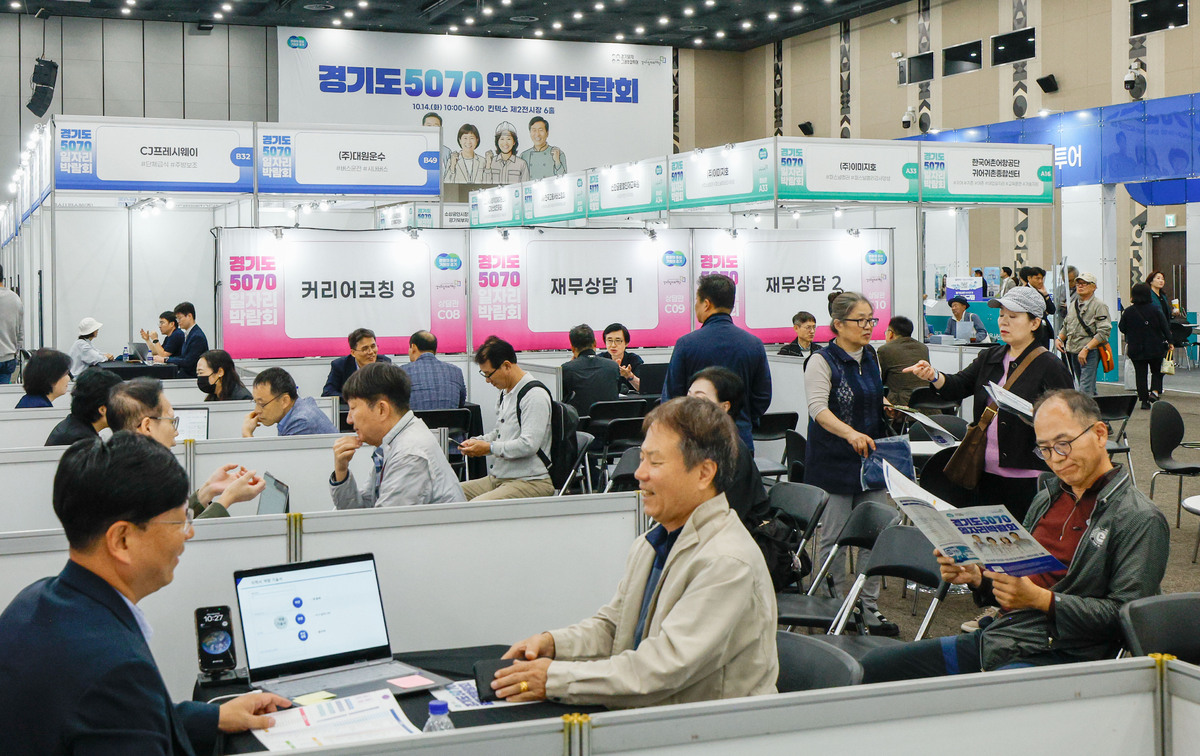 14일 경기 고양시 일산서구 킨텍스에서 열린 경기도 5070 일자리박람회가 열린 가운데 구직자들이 박람회를 찾고 있다. 14일 경기 고양시 일산서구 킨텍스에서 열린 경기도 5070 일자리박람회가 열린 가운데 구직자들이 박람회를 찾고 있다. 경기도에 따르면 이번 박람회는 경기북부권을 중심으로 50~70대 중장년 구직자와 기업을 직접 연결, 재취업 기회를 넓히기 위해 추진된다.