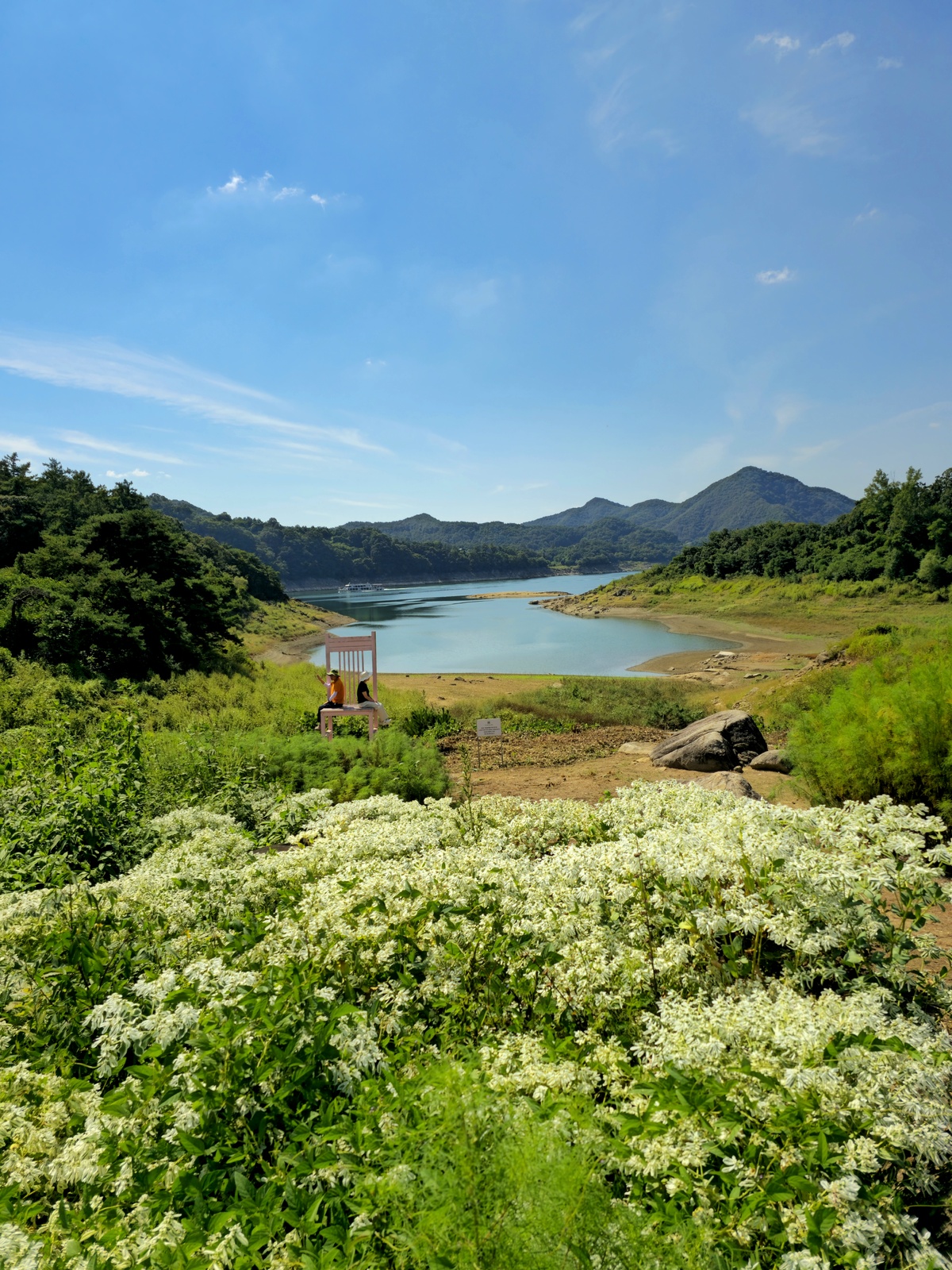 카페 글루글루 앞 정원 설악초와 청풍호. 선선한 가을바람 분다. 하늘을 끌어안은 거울처럼 맑고 투명한 푸른 호수 위로. 바람 따라 꽃보다 고운 물결 만드는 하얀 설악초 군락, 그 샛길 따라 호수까지 펼쳐지는 서정적 풍경은 사랑하는 이의 반가운 편지를 닮았다. 가을 길 느린 호흡으로 걸어 도시 소음 저만치 물러난 청풍호 앞에 섰다.
