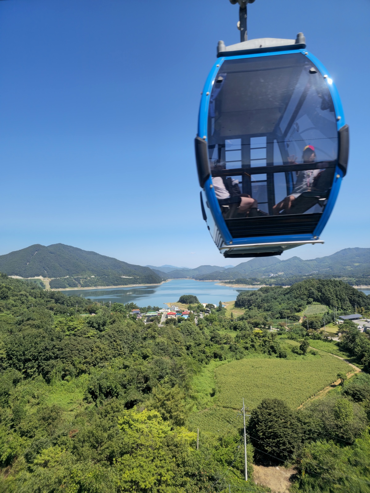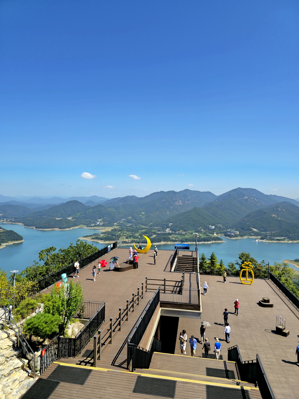 비봉산 정상 전망대. 청풍호 가운데 우뚝 솟은 비봉산에 오르면 산과 물이 어우러지는 청풍호 풍경을 제대로 만날 수 있다. 비봉산 정상까지 2.3km 구간을 운행하는 청풍호반 케이블카를 타면 된다. 청풍면 물태리 정류장에서 출발한 케이블카가 순식간에 고도를 높이자 발아래 펼쳐지는 절경에 탄성이 터진다. 약 10분을 날아 정상 정류장에 도착하니 오늘따라 날이 아주 맑아 시력이 갑자기 좋아진 것처럼 먼 산까지 또렷하다. 제천 시내 동쪽으로 금월봉, 작성산, 신선봉, 청풍대교, 소백산, 옥순대교가 파노라마로 펼쳐지고 서쪽으로는 저 멀리 용두산, 대덕산, 감악산이 손에 잡힐 듯 가깝다. 고개를 뒤로 돌리면 모멘트 캡슐 전망대 너머 충주시 쪽으로 월악산, 악어섬, 참실리 마을이 어우러져 그림 같은 풍경을 선사한다. 해발 531m 비봉산은 봉황새가 알을 품고 있다가 먹이를 구하려고 비상하는 모습과 닮아 이런 이름을 얻었다. 비봉산 정상에 서면 사방이 짙푸른 청풍호로 둘러싸여 마치 넓은 바다 한가운데 섬에 오른 기분이다.