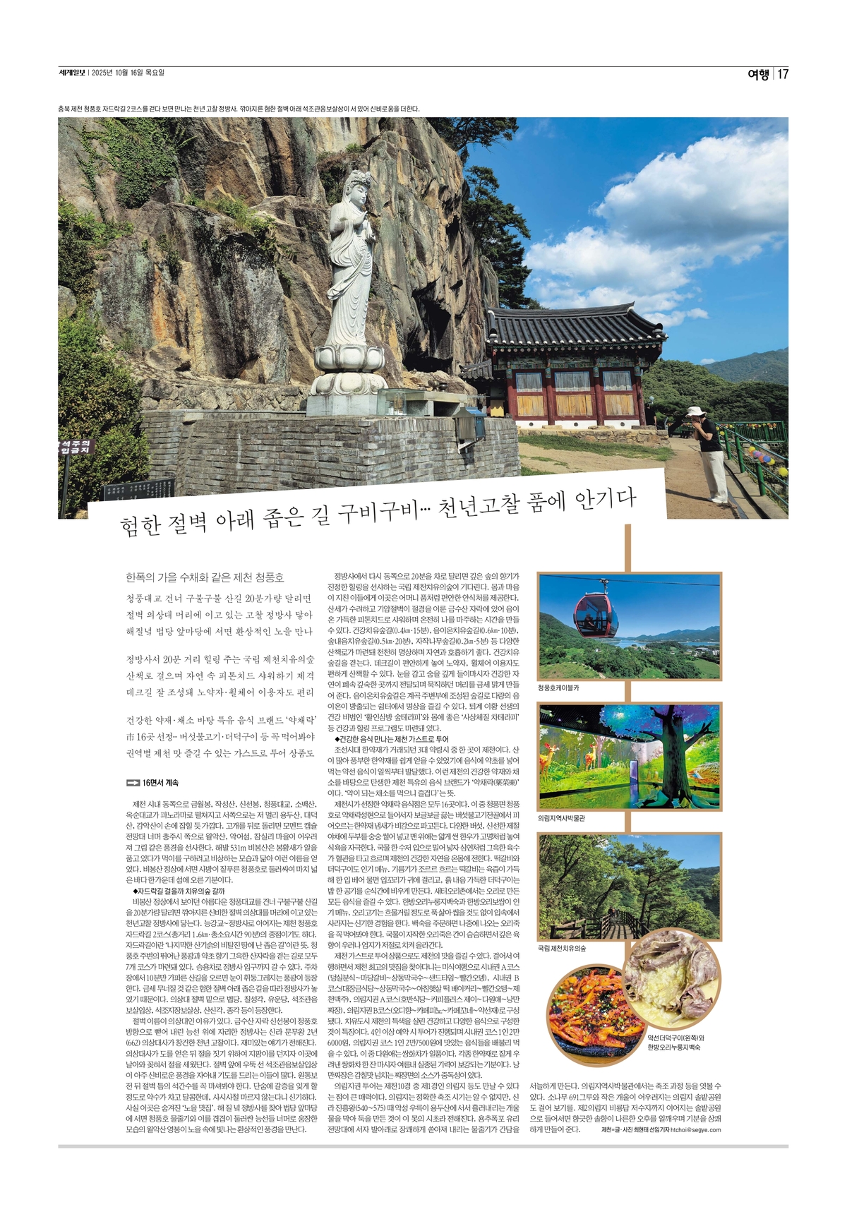 세계일보 여행면. 편집=김창환 기자 ◆설악초 활짝 핀 청풍호를 걷다 청풍명월(淸風明月). 충북 제천의 청정 자연을 표현하는 말인데 참 잘 지었다. 푸른 바람과 맑은 달이라니. 이보다 어울리는 말이 또 있을까. 맑은 청풍호와 높고 푸른 비봉산이 어우러지는 절경을 즐기다 보면 번잡한 머릿속이 청명한 자연으로 가득 채워지니 제천은 가을 낭만을 즐기기 좋은 곳이다.