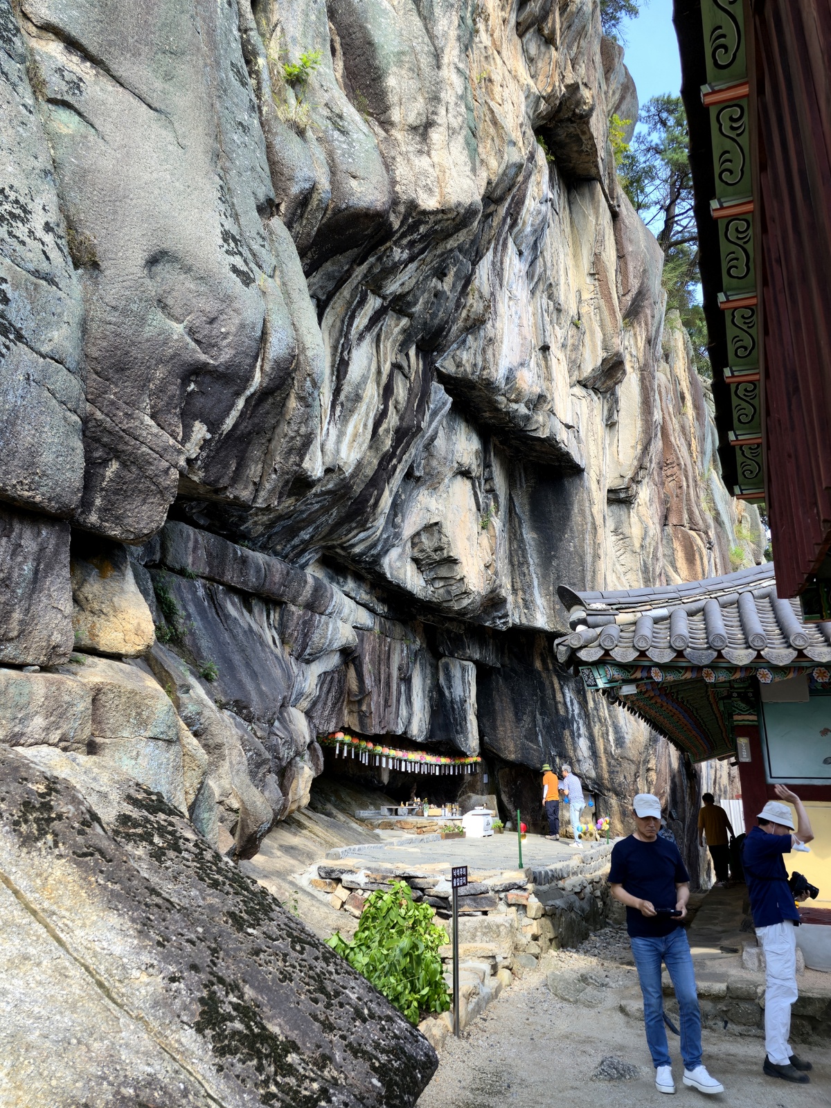 정방사. ◆자드락길 걸을까 치유의숲 갈까 비봉산 정상에서 보이던 아름다운 청풍대교를 건너 구불구불 산길을 20분가량 달리면 깎아지른 신비한 절벽 의상대를 머리에 이고 있는 천년고찰 정방사에 닿는다. 능강교~정방사로 이어지는 제천 청풍호 자드락길 2코스(총거리 1.6㎞·총소요시간 90분)의 종점이기도 하다. 자드락길이란 ‘나지막한 산기슭의 비탈진 땅에 난 좁은 길’이란 뜻. 청풍호 주변의 뛰어난 풍광과 약초 향기 그윽한 산자락을 걷는 길로 모두 7개 코스가 마련돼 있다. 승용차로 정방사 입구까지 갈 수 있다. 주차장에서 10분만 가파른 산길을 오르면 눈이 휘둥그레지는 풍광이 등장한다. 금세 무너질 것 같은 험한 절벽 아래 좁은 길을 따라 정방사가 놓였기 때문이다. 의상대 절벽 밑으로 법당, 칠성각, 유운당, 석조관음보살입상, 석조지장보살상, 산신각, 종각 등이 등장한다.