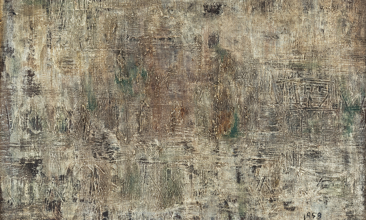 한묵, ‘우기’(1958). 한묵의 1950년대 작품 중에서도 거의 유일하게 형상이 완전히 사라진 순수 추상의 모습을 보여준다. “그룹전이라면 더러는 전시장에서 서로 좋은 자리에 자기 그림을 걸려고 전전긍긍하는 바보들의 행진 같은 야박스러운 일이 있을 수도 있지만 한국 최초로 결성된 그룹 모던아트 동인들은 모두가 초연한 자세여서 그런 부끄러운 일이 추호도 없었다. ” 모던아트협회에 합류한 천경자는 1984년 이같이 회고했다. 특정한 양식을 강제하지 않고 구상과 추상, 표현주의와 절대추상을 모두 아우르며 폭넓은 스펙트럼을 허용한 이 ‘열린 연대’는 이후 한국 현대미술의 다양한 작가 그룹과 실험적 전시의 토대가 됐다.