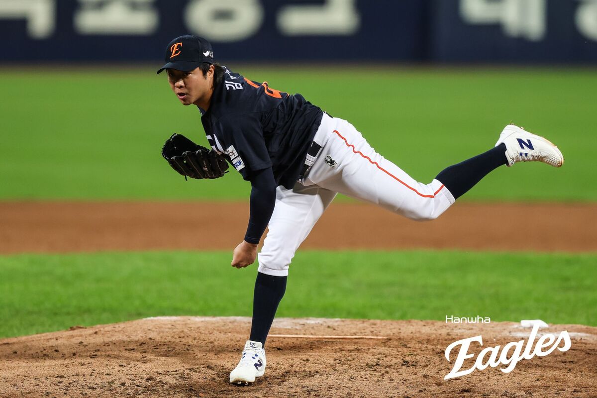 위급한 순간, 가장 먼저 떠올리는 카드다. 지난 18일 삼성과의 플레이오프(PO·5전3선승제) 1차전이었다. 9회 초 마무리 김서현이 흔들렸다. 아웃카운트 1개를 잡는 동안 2실점했다. 점수 차가 9-8까지 좁혀진 상황. 김범수가 투입됐다. 김지찬과 김성윤을 연거푸 범타로 돌려세우며 승리를 지켰다. PO 3차전도 급박했다. 선발투수 류현진이 4이닝 만에 강판된 것. 예상보다 훨씬 이른, 5회 초 출격했다. 볼넷을 내줬지만 병살을 이끌어내며 실점 없이 이닝을 마쳤다.