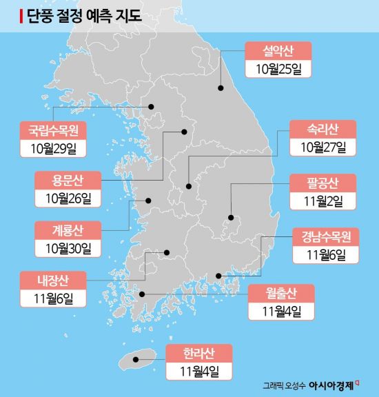 전라권에서는 월출산이 다음 달 4일, 내장산이 다음 달 6일에 단풍 절정을 맞을 것으로 보인다. 제주에서는 한라산의 단풍 절정일이 다음 달 4일로 예측됐다.
