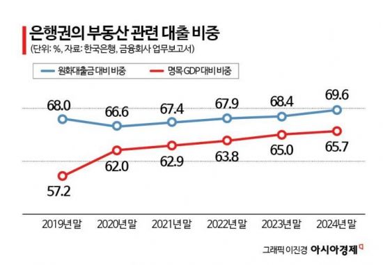 작년 국내 부동산 부문에 공급된 금융권 자금은 약 4137조원으로, 국내총생산(GDP) 대비 비중이 9년 새 1.5배 급증했다. 은행권의 부동산 관련 대출 잔액은 2019년 말 1167조원에서 2024년 말 1674조원으로 늘었다. 전체 대출에서 부동산 대출 비중 역시 2020년 66.6%에서 2024년 69.6%로 꾸준히 상승했다. 금융회사는 부동산 담보대출 중심의 안정적 수익을 확보했지만, 그 결과 경제의 성장동력은 약화하고 지방과 수도권의 격차는 커졌으며 가계소비 위축으로 민생경제도 악화했다.