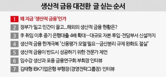 생산적 금융은 가계부채나 부동산 등 비생산적인 분야에 쏠려 있던 한국의 금융산업을 기업 혁신과 신산업 투자, 구조 조정 등 금융 본연의 역할로 돌아갈 수 있도록 만드는 정책이다. 2017년 문재인 정부 시절에 처음 도입됐고 문 정부를 계승하는 이재명 정부에서 다시 정책을 꺼내 들었다.