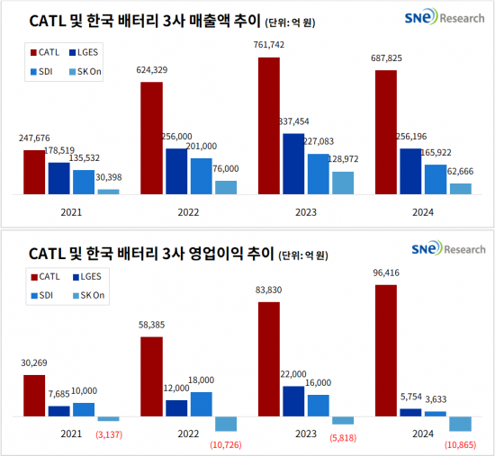 중국 닝더스다이(CATL)가 매출과 수익성 모두에서 한국 배터리 3사(LG에너지솔루션·삼성SDI·SK온)를 크게 앞지르며 글로벌 배터리 시장의 구조적 격차를 드러냈다. 양국의 산업 구조적 차이가 이같은 결과를 초래했다는 분석이 나온다.