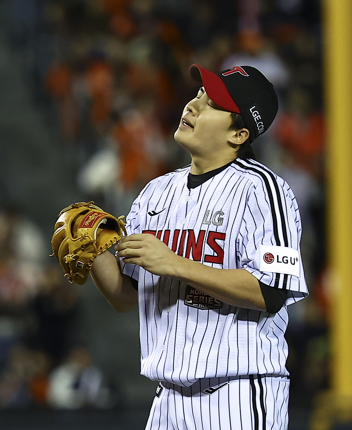 LG 임찬규가 27일 서울 잠실야구장에서 열린 한화와의 2025 KBO 포스트시즌(PS) 한국시리즈(KS·7전4선승제) 2차전에 선발 등판해 아쉬운 표정을 짓고 있다. 사진=뉴시스 김영우가 첫 타자 루이스 리베라토를 2루 뜬공으로 잡았지만, 문현빈에게 밀어내기 볼넷을 내주면서 임찬규의 실점은 5점으로 불어났다. 오지환의 실책으로 인해 비자책점으로 기록됐으나, 아쉬움의 정도에는 변함이 없었다. 불행 중 다행으로 이어 등판한 김진성이 위기를 틀어막으면서 LG의 녹록지 않았던 4회초의 문이 닫혔고, 임찬규도 한숨을 돌렸다.