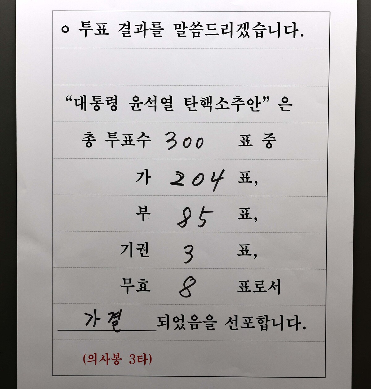2024년 12월 3일 비상계엄 선포의 영향으로 의결된 대통령(윤석열) 탄핵소추안에 대한 표결 결과를 발표하기 위해 작성된 표결지. 허정호 선임기자