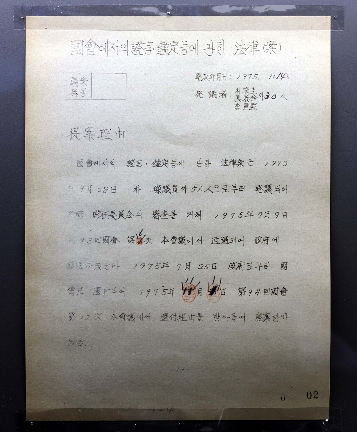 여의도 국회의사당에서 처음 통과된 법률안인 「국회에서의증언·감정등에관한법률안」.국회의 특정사안에 대한 조사 또는 안건 심의와 직접 관련해 행하는 증언 감정 등의 절차를 규정하는 내용을 담고 있다. 허정호 선임기자 주요 전시자료로는 국회의사당 설계도면이 담긴 ?국회의사당 신축공사 현황보고서?(1975)와 ?국회의사당 준공식 테이프 커팅식 물품?(1975), 제2대 국회부터 현재에 이르는 ?국회의원 배지?(1950∼2025), 여의도 국회의사당에서 최초로 통과된 법률안인 ?국회에서의증언·감정등에관한법률안?1975) 등이 있다.