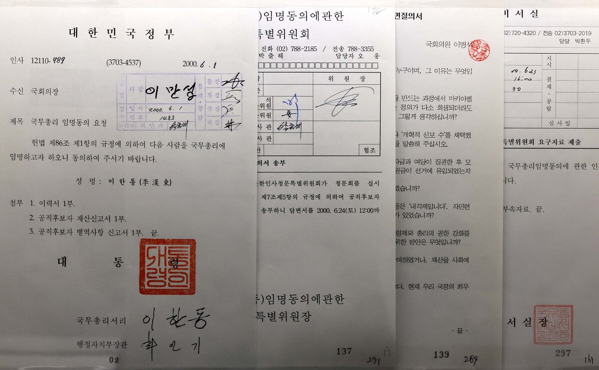 국무총리 임명동의 요청 서류. 2000년 공직후보자의 자질과 업무 적합성을 국회에서 검증하기 위한 인사청문회 제도가 처음 실시됐다. 이한동 국무총리 서리의 임명 과정에서 실시됐고 이후 현재까지 이어지고 있다. 허정호 선임기자 국회박물관 1층 기획전시실에서 열리는 이번 특별전은 국회박물관 운영시간(월∼금 10:00∼18:00, 토 10:00∼13:00)에 방문해 무료로 관람할 수 있다. 허정호 선임기자 hoya@segye.com