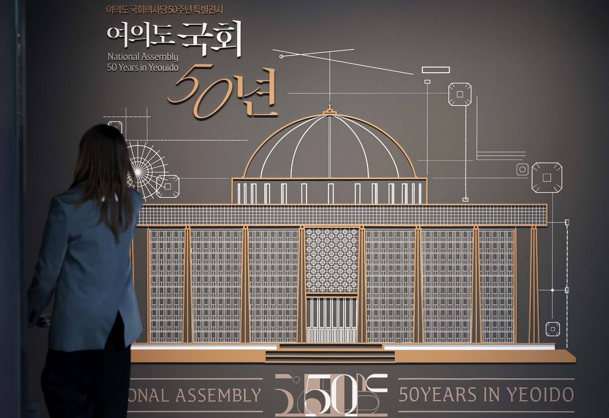 국회박물관에서 여의도 국회의사당 50주년 특별전시 「여의도 국회 50년」 특별전이 열리고 있다. 허정호 선임기자 1부 “국회의사당을 짓다”는 국회의사당 설계 및 건축 과정을 소개하는 공간이다. 2부 “여의도 국회, 시대를 담다”는 ▲지난 50년간 국회 고유의 기능·권한 확대 ▲국회 경내 부속건물 건립 ▲입법 지원조직 설립 과정을 소개하는 공간이다. 3부 “국민과 함께”는 관람객들이 축하 메시지를 영상에 송출하고 국회의사당 엽서를 직접 제작할 수 있는 공간이다.
