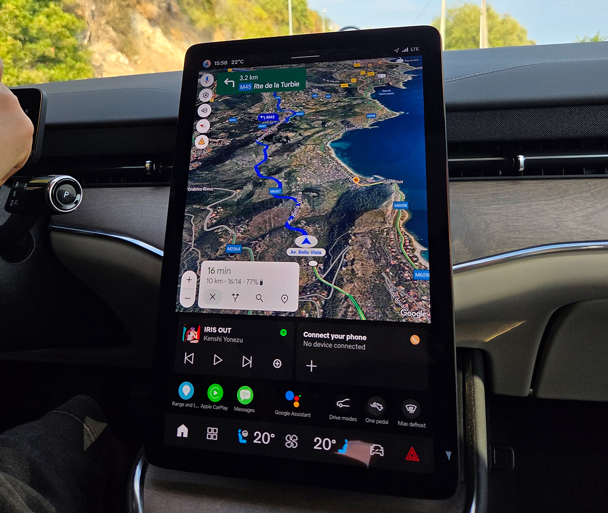 내부 디스플레이. 백소용 기자 ES90은 역동적인 시승 구간을 통과하며 다양한 매력을 드러냈다. 최대 속도 시속 50㎞ 이하로 제한된 도심에서 가다 서다를 반복할 때는 전기차의 회생제동을 이용해 브레이크를 많이 밟지 않고 주행을 이어갔다. 고속도로에서 가속페달을 밟자 묵직하면서도 빠르게 속도가 올라갔다. ES90은 싱글모터 후륜구동, 트윈모터 사륜구동, 트윈모터 퍼포먼스 사륜구동 세 가지 트림으로 구성됐는데, 시승차인 싱글모터 트림은 최고 출력 245㎾(333마력), 최대 토크 480Nm의 힘을 낸다. 정지 상태에서 시속 100㎞까지 이르는 데 6.9초가 걸린다. 지중해 연안 프로방스알프코트다쥐르 지역에서 왕복 2차선의 좁고 구부러진 산길은 시승 구간의 하이라이트였다. 알프스 남서부 산맥에서 이어진 험준한 지형을 따라 난 길은 ES90의 준대형 차체가 움직이기 버거워 보였다. 중·소형차가 경쟁적으로 레이싱을 하듯이 지나가는 이 길에서도 차량은 이질감 없이 여유롭게 치고 나갔다. 급경사길에서 빠른 속도로 달려도 차량은 안정적이었다. 운전자가 원하는 방향대로 위치를 잡았다.