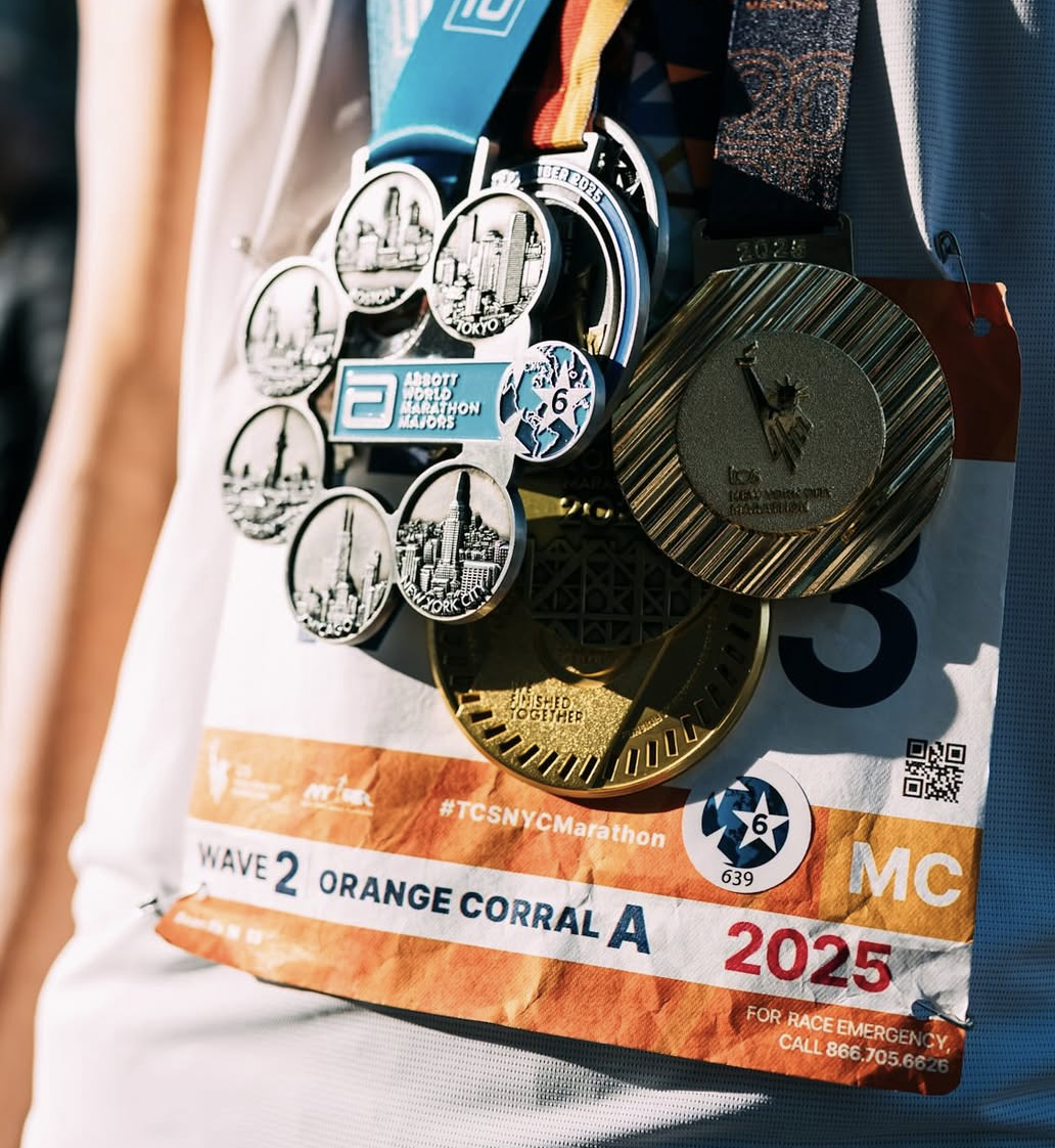 사진 속 션은 뉴욕 도심을 배경으로 여러 개의 마라톤 완주 메달을 목에 걸고 포즈를 취하고 있다.