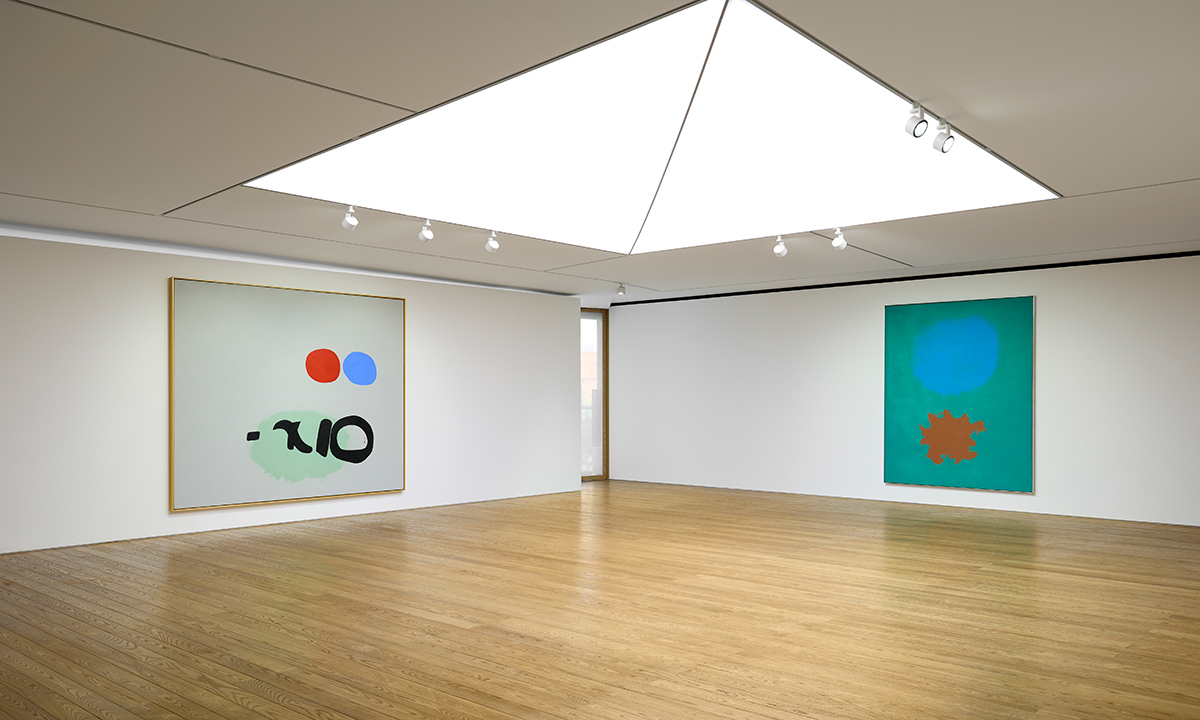 ‘추상의 언어, 감성의 우주: 아돌프 고틀리브와 김환기’전 전시 전경. 페이스갤러리 제공 김환기의 절정기인 1971년에 만든 전면점화도 볼 수 있다. 절제된 구성과 세밀하게 배치된 점들로 이뤄진 화면은 하늘과 바다, 별자리를 연상시키며, 시간과 공간을 시적 추상으로 전환했다. 이 시기 완성된 그의 대표작 ‘점화’(點畵) 연작은 한국 모더니즘이 세계 무대에 소개되는 데 핵심적인 역할을 했다. 한 층 올라가면 김환기의 ‘뉴욕시대’를 이끈 고틀리브의 작품 6점이 전시돼 있다. 이번 전시에선 그의 예술적 정점인 ‘버스트’(Burst) 연작들도 만날 수 있다. 부유하는 구체와 폭발적인 붓질을 병치해 하늘과 땅, 정신과 감각 등을 표현했다. 이 같은 회화 구성은 질서와 혼돈, 색채와 형식 사이의 긴장을 극적으로 드러내며, 서사를 제시하기보다는 보편적이고 직관적인 감정적 반응을 이끌어낸다.