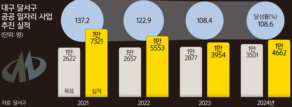 달서구는 2023년 달서형 일자리 정책인 ‘달서웨이 일자리 프로젝트’를 수립했다. 6319억원을 들여 2026년까지 공공부문(5만2179개)과 민간부문(889개)을 포함해 5만3068개의 일자리를 창출하는 게 목표다. 민선 7·8기 일자리도 빠르게 늘었다. 공공부문 일자리는 2021년 목표 인원이 1만2622명이었지만 1만7321명이라는 실적을 올려 목표 대비 37% 초과 달성했다. 이듬해인 2022년에도 1만5553명이라는 실적을 거둬 목표(1만2657명) 대비 22%를 초과 달성했다. 지난해 목표 인원은 1만3501명. 역시 1만4662명의 일자리를 창출해 목표 대비 8.5%의 성과를 기록했다. 민간부문 일자리도 증가세로 2022년과 2024년 목표 인원이 403명과 244명이었지만 각각 30.7%, 35.2% 늘었다.