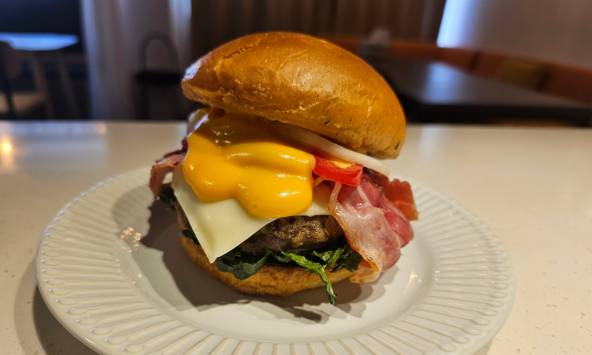 ① 다진 양파, 마늘, 버섯, 고사리, 베이컨은 버터에 볶은 뒤 식혀준다. ② 식은 야채와 소고기를 섞고 빵가루와 우유 소금과 후추를 넣어 치댄다. ③ 팬에 노릇하게 굽는다. ④ 햄버거 번은 앞뒤로 구운 뒤 청상추와 마요네즈를 올려준다. ⑤ 패티 위에 슬라이스 치즈와 구운 베이컨, 양파 토마토를 얹고 빵 뚜껑을 올려 마무리한다.