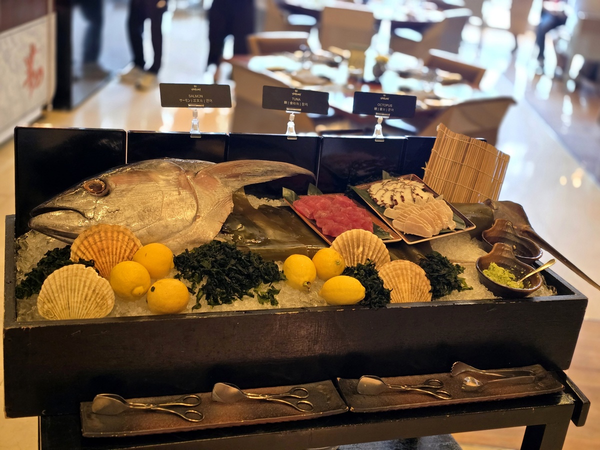 일식당 야쿠미. 일식당 야쿠미 홍합 새우 요리. 일식당 ‘야쿠미’는 도쿄의 유명한 도요스 수산시장에서 매주 2회 신선한 최고급 식재료를 공수한다. 낮에는 뷔페식으로 운영하기 때문에 제대로 즐기려면 위를 좀 비우고 가야 한다. 석화, 가리비, 모시조개, 홍합 등 신선한 해산물에서 립아이 스테이크, 얇게 저민 야키니쿠 스타일 소고기, 호주산 양갈비, 닭 꼬치 요리까지 다양하다.